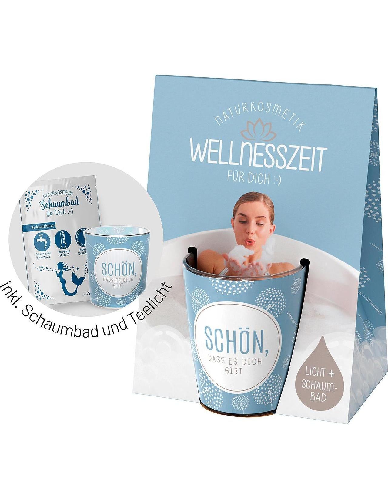 Wellnesszeit Dieses Set eignet sich perfekt als Geschenk, um jemandem eine Freude zu machen. Das wohlriechende Duschgel und das schöne Windlicht (inkl. Teelicht) sind die perfekte Kombination und laden zum entspannenden Baden bei Kerzenlicht ein. Inhalt: Schaumbad + Licht Masse: 14 x 10,2 x 8 cm (Verpackung).