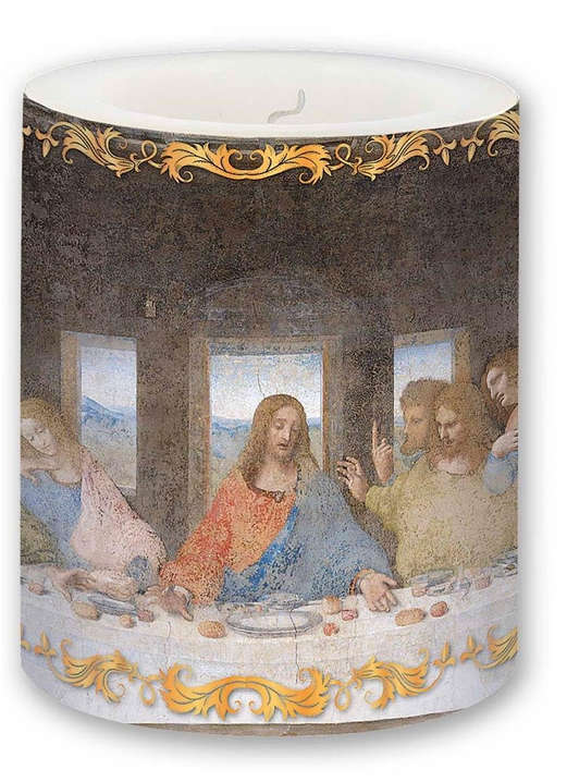 Diese grosse Lampionkerze ziert das berühmte Motiv Das Abendmahl (1494–1498) von Leonardo da Vinci. Das weltbekannte Motiv auf der Kerze zeigt Jesus mit den zwölf Aposteln, beim letzten gemeinsamen Abendmahl vor seiner Kreuzigung. Entzünden Sie die Kerze und len Sie das Motiv, das von innen von der Kerze beleuchtet wird, Ihr Heim erhellen und für eine ganz besondere Atmosphäre sorgen. Da die Kerze so gestaltet ist, d sie nur in der Mitte herunterbrennt, während der schöne Rand erhalten bleibt, kann die Lampionkerze nach dem Abbrennen mit einem Teelicht weiterverwendet werden. (umlaufen farbiges Motiv)