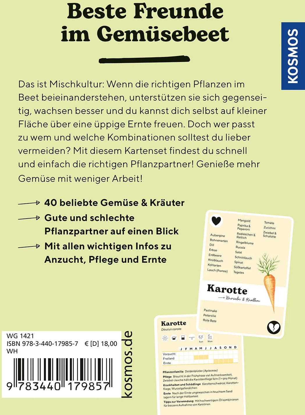 Dieses einmalige Kartenset zeigt auf 40 stabilen Karten je eine beliebte Gemüse-, Obst- oder Kräutersorte, listet passende und unpassende Pflanzpartner auf und liefert alles Wissenswerte rund um die jeweilige Pflanze.