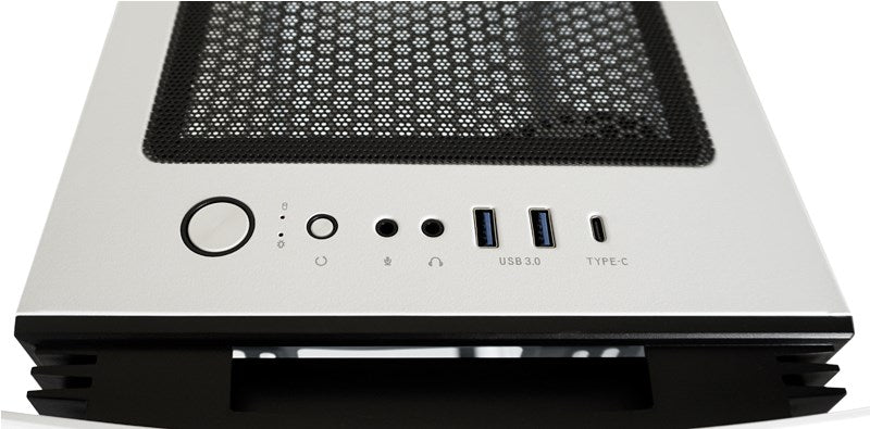 Das auf der Oberseite des Gehäuses eingearbeitete I/O-Panel enthält eine Power- und Reset-Taste sowie einen USB-C- und zwei USB-A-Ports.