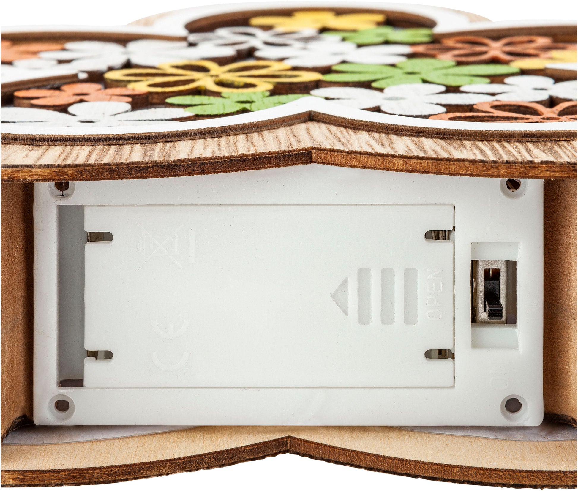 In den Abendstunden oder an trüben Nachmittagen erhellt stimmungsvoller Lichterschein die Blüten. Das Durchbruchmuster ist mit Folie im Pergamentpapier-Optik unterlegt, das sorgt für weiches Licht. Dank Batteriebetrieb stört beim Dekorieren kein Kabel und der Timer übernimmt auf Wunsch sogar das Ein- und Ausschalten für Sie!