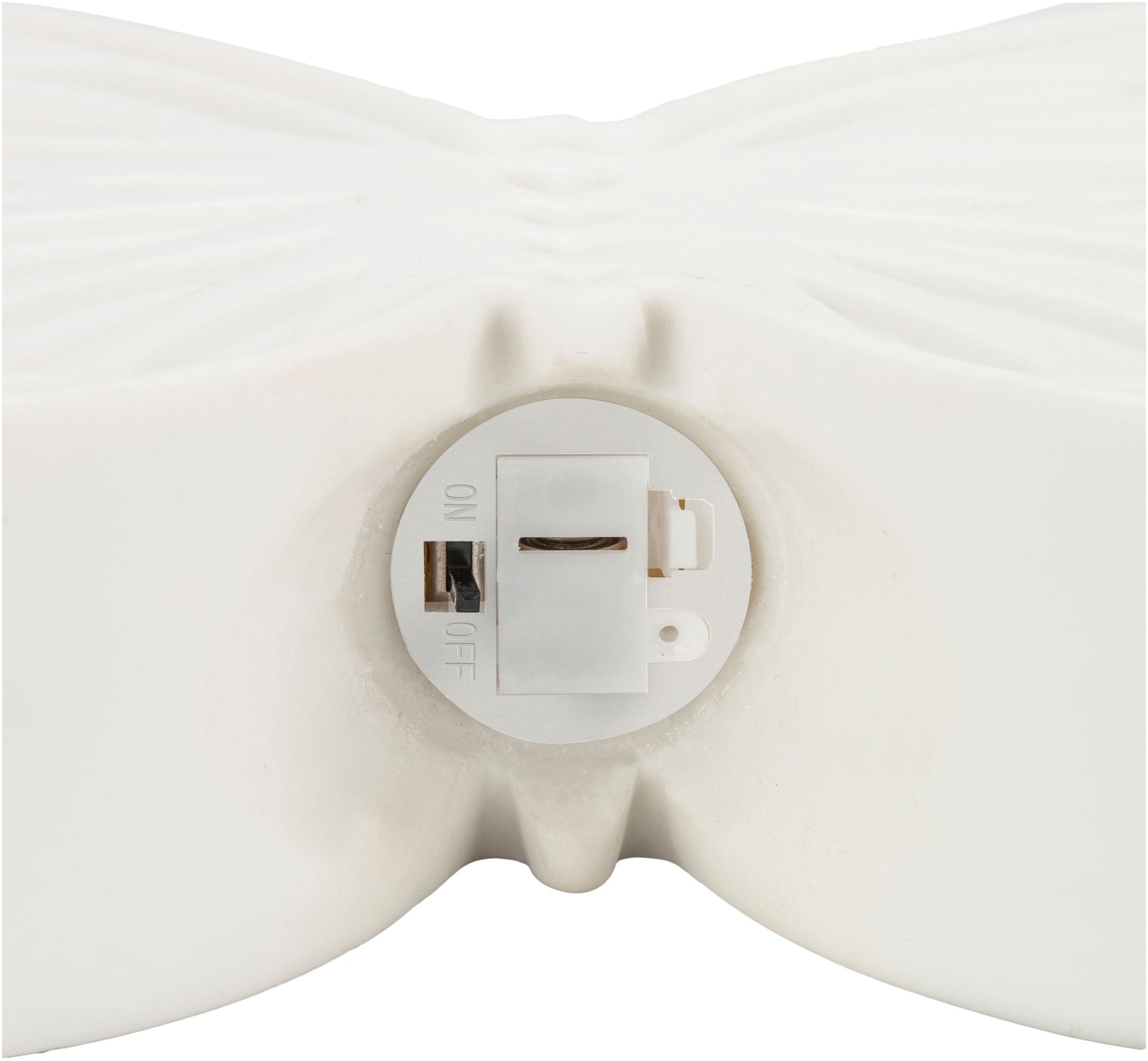 Bereits untertags ist der weiße Porzellan-Schmetterling eine wahre Zierde auf der Fensterbank, auf dem Sideboard oder in der Vitrine. Kunstvolle Reliefmuster schmücken die Flügel auf Vorder- und Rückseite und kommen auf der matten Oberfläche schön zur Geltung.