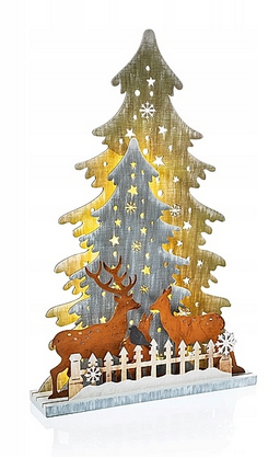 Wenn Sie die LED-Dekoration einschalten, erhellt warmes Licht die kunstvolle Szenerie. Auch ohne Beleuchtung ist dieser Winterwald ein Blickfang in Ihrer Wohnung. Die Hirschfamilie besteht aus Metallfiguren mit rostfarbenem Finish. Der nostalgische Gartenzaun mit einem Vogel und zwei Tannenbäumen ist aus Holz gefertigt und mit einer Wischtechnik gefärbt; sie sehen aus wie Silhouetten, zarte Schneeflocken und Sterne schmücken die Bäume als Öffnungen.