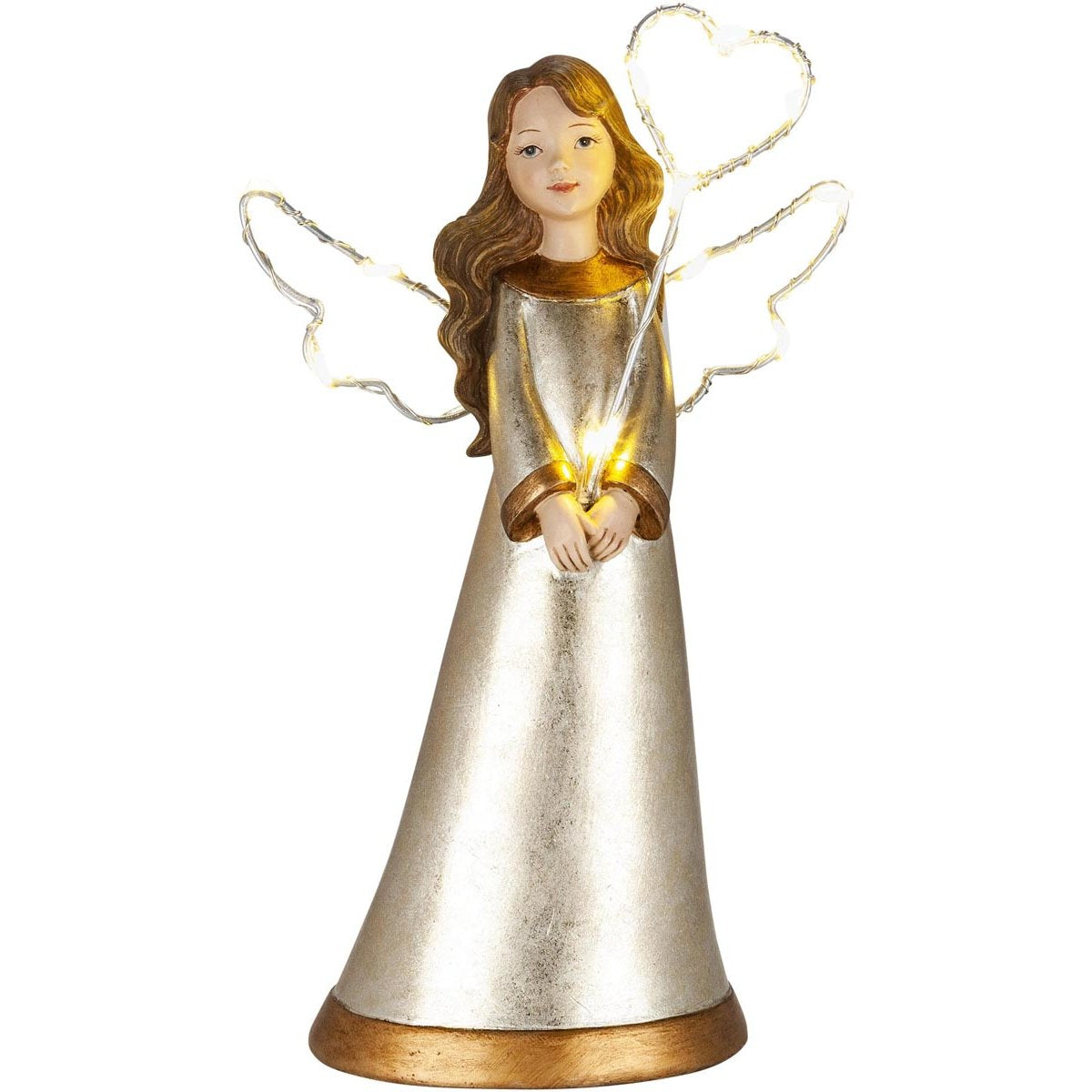 Die dekorative Engelsfigur "Lara", die bis ins kleinste Detail aufwendig und reich verziert ist, schimmert wunderschön in Gold und Silber. Ihre Flügel und der Stab mit Herzform, welchen sie hält, werden von 13 LEDs mit warmweissem Licht beleuchtet.