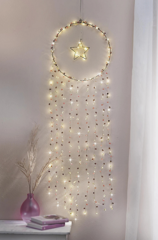 Schwelgen Sie in Farbe! Der Licht-Ring setzt einen prächtigen Akzent. 100 LEDs bringen die Ziersteinchen zum Strahlen ... in Rosa, Klar und Lila, den Trendfarben der kommenden Saison. Ein Sternchen funkelt in der Mitte und verzaubert Ihr Zuhause mit seinem stimmungsvollen Licht.