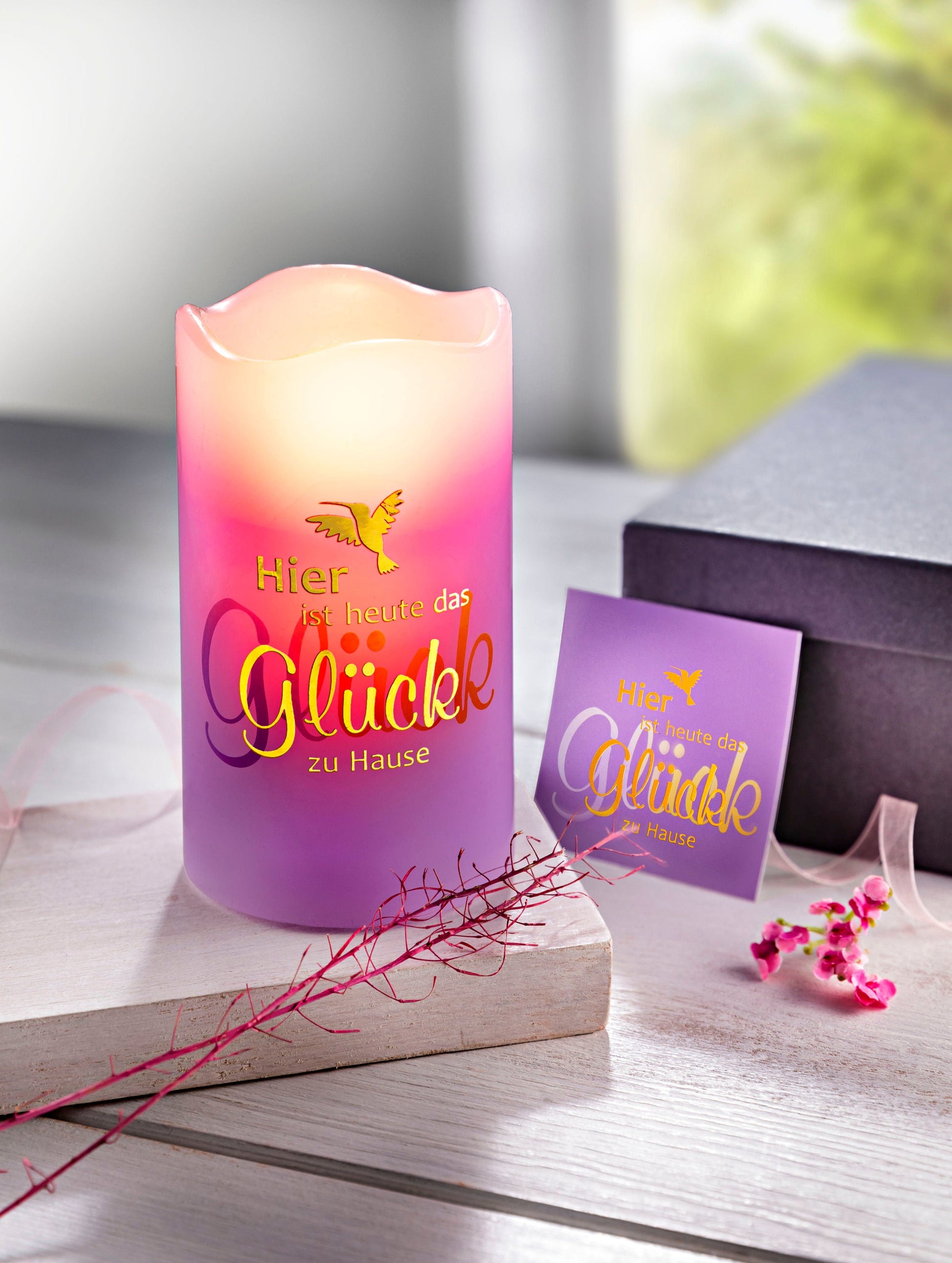 Glück-Wunsch zum Verschenken: LED-Echtwachskerze „Glück zu Hause“