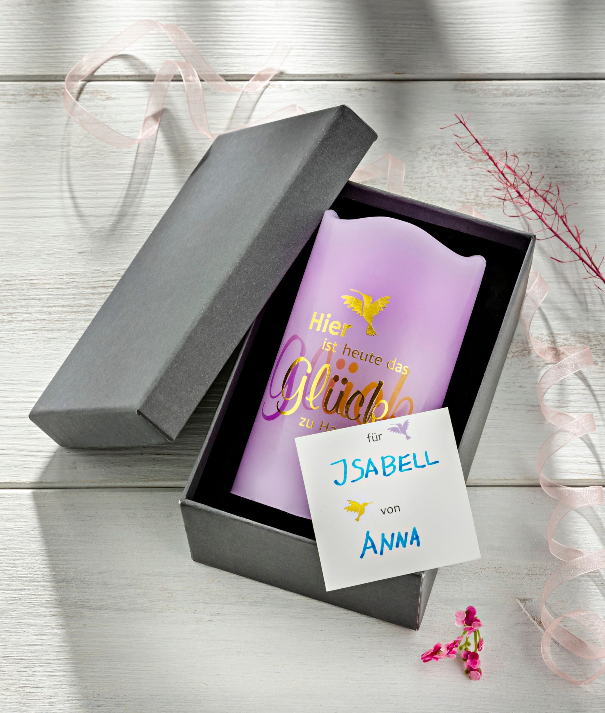 Geschenk-Idee zum Glücklichmachen: Die LED-Echtwachskerze „Glück zu Hause“ feiert die schönen Momente im Leben – und das sind mehr, als man manchmal denkt. Lassen Sie Fröhlichkeit und ein positives Lebensgefühl einkehren in Ihren vier Wänden!