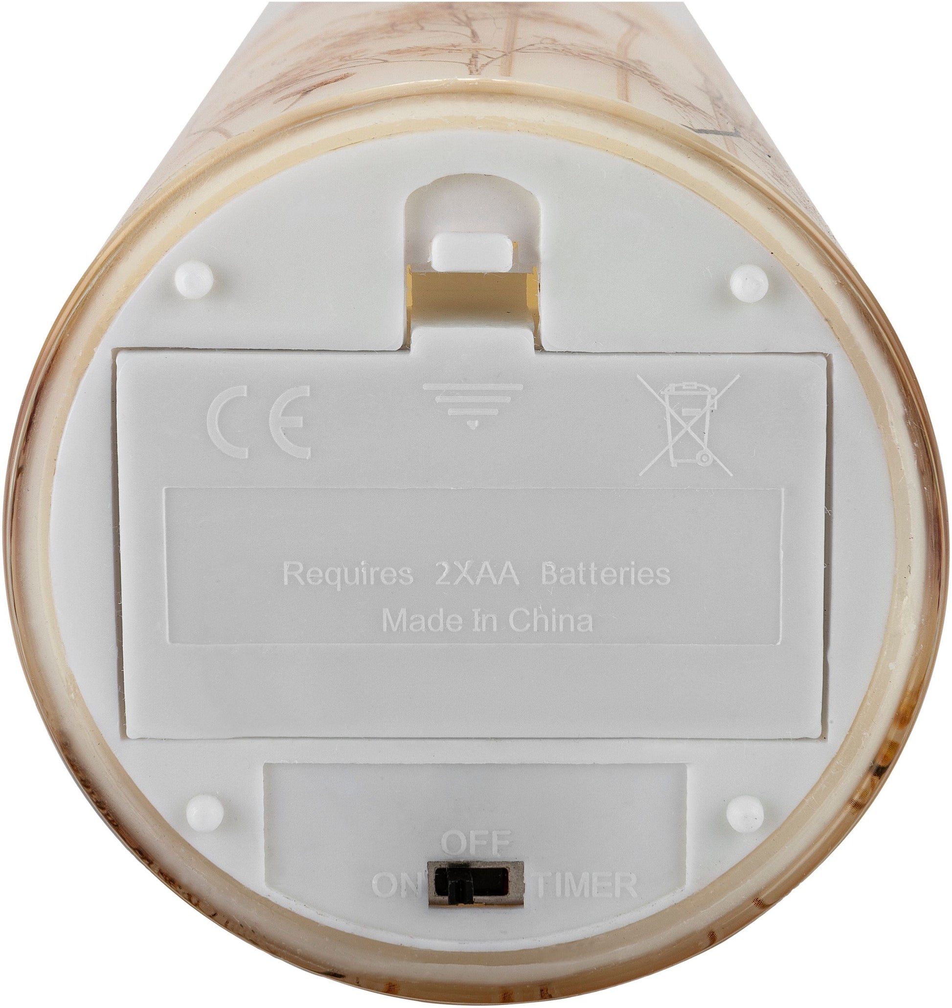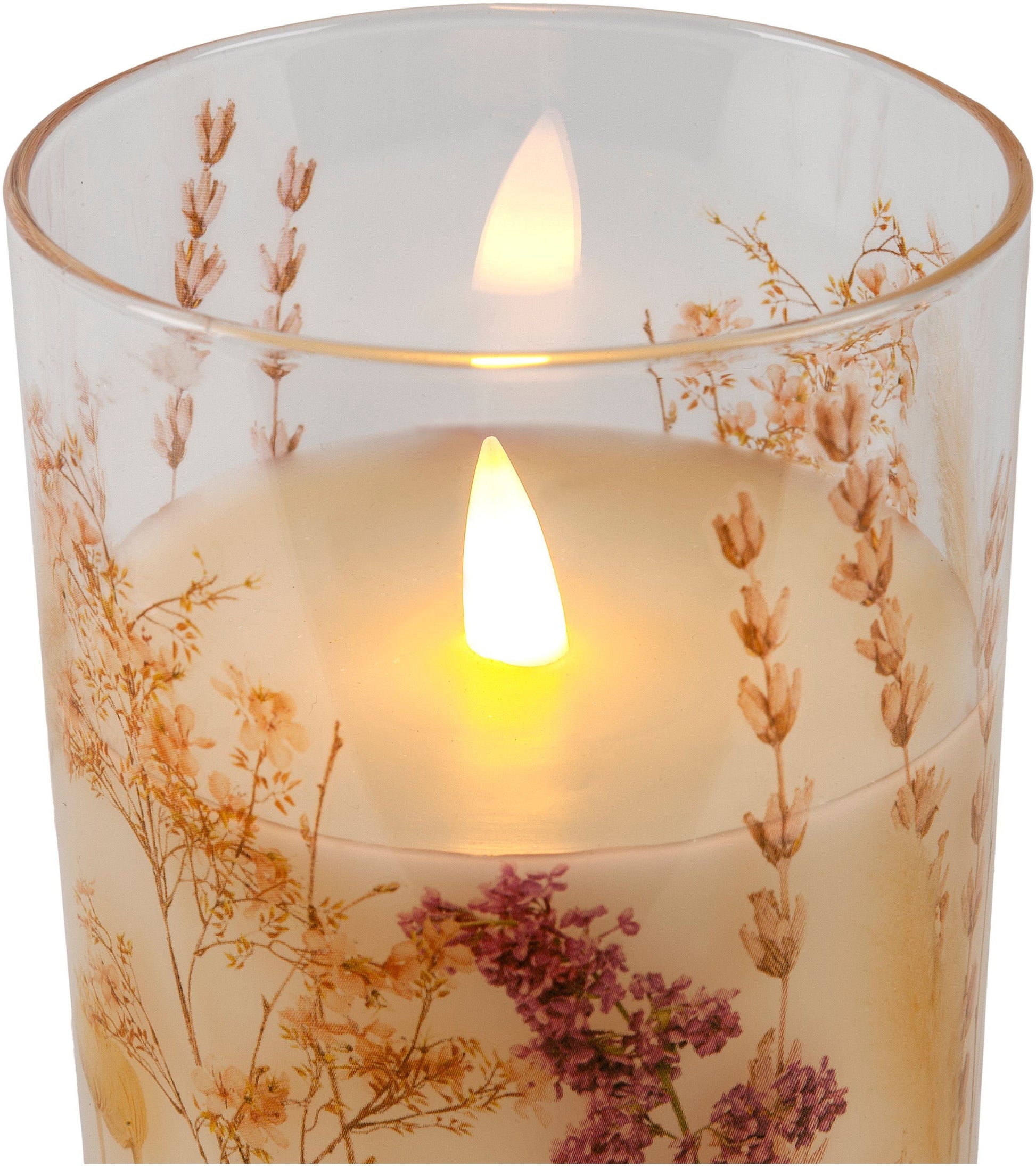 Selbst ohne Beleuchtung sind diese LED-Echtwachskerzen attraktive Wohn-Accessoires. Jede Kerze steckt in einem Glaszylinder mit Rundum-Dekor, die filigranen Blüten darauf erinnern an Trockenblumen und sind unglaublich detailfein gestaltet.