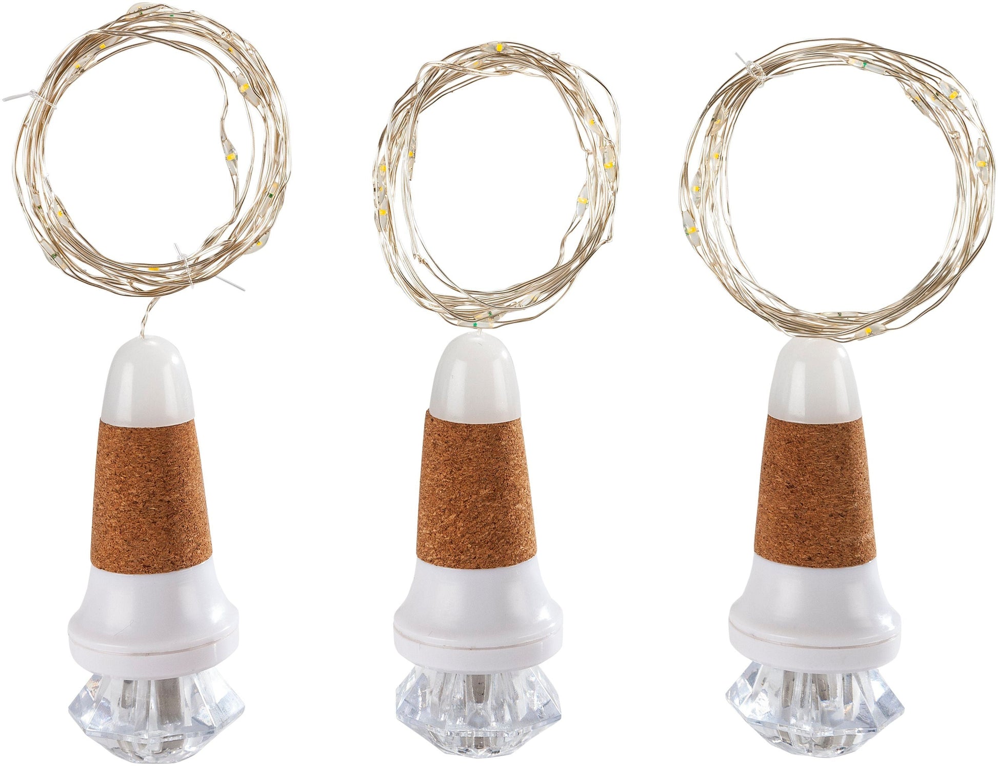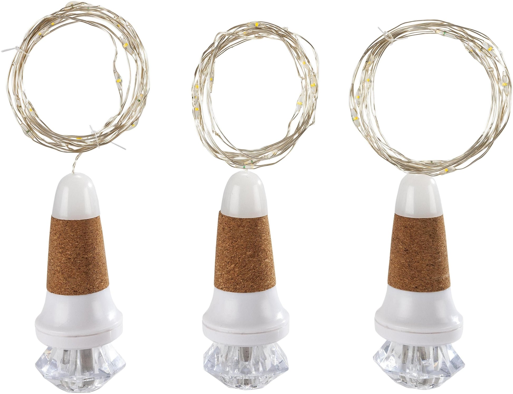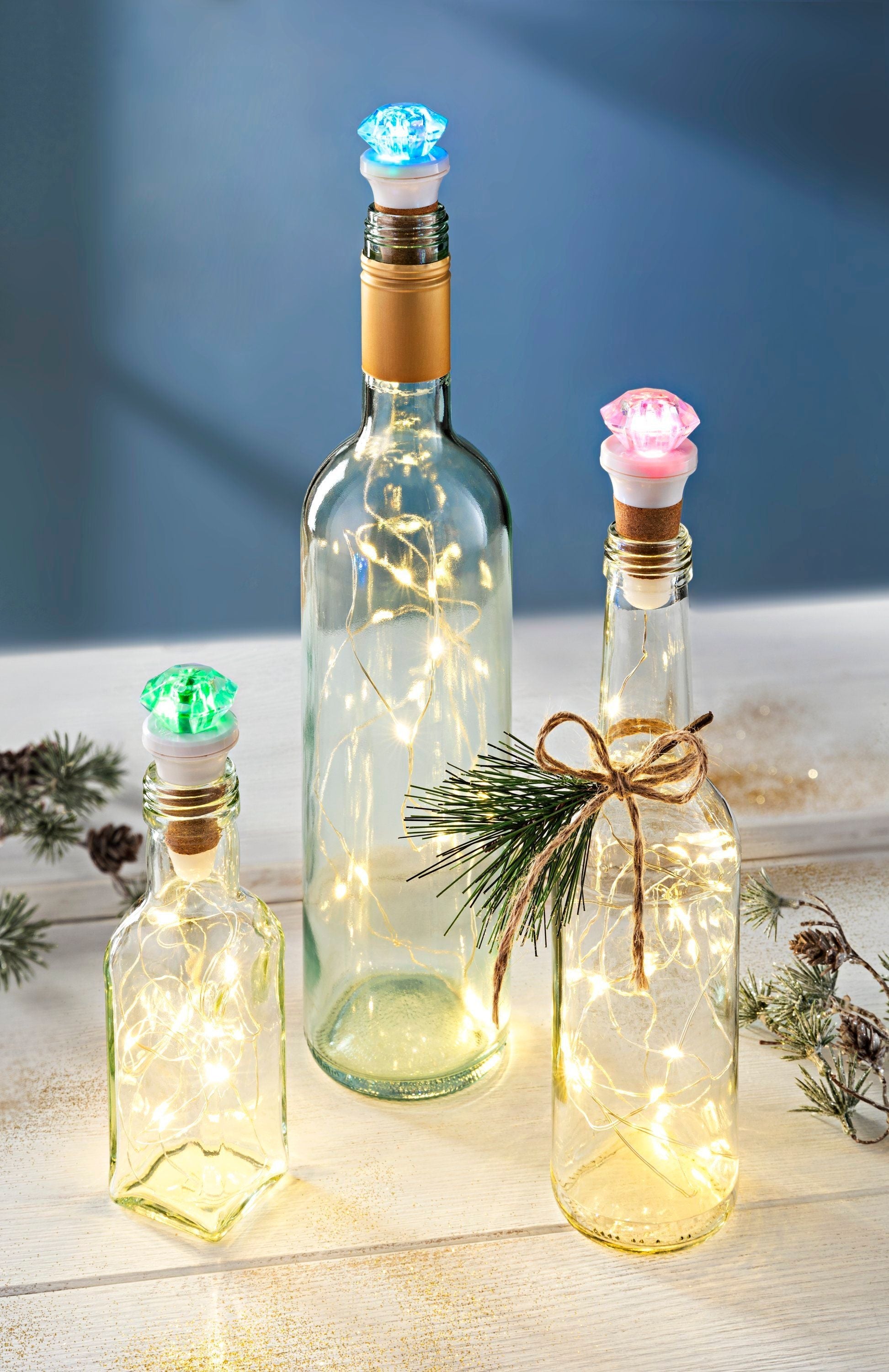 Diese Flaschenlichter sorgen im Nu für stimmungsvollen Lichterglanz! Einfach die Lichterketten in einer leere Glasflasche geben, oben den Korken einsetzten und anknipsen. Schon verbreiten die Flaschen warm-weißes Licht und werden selbst zum zauberhaften Deko-Objekt. Jedes der LED-Flaschenlichter ist oben am Korken mit einem funkelnden "Kristall" versehen. Dieser wird auch beleuchtet - und sein Licht wechselt sogar die Farbe! Der "Kristall" lässt sich abnehmen - darunter verbirgt sich der USB-Anschluss. Damit sind die Flaschen-Lichterketten mit ihren 15 warm-weißen LEDs immer wieder aufladbar.