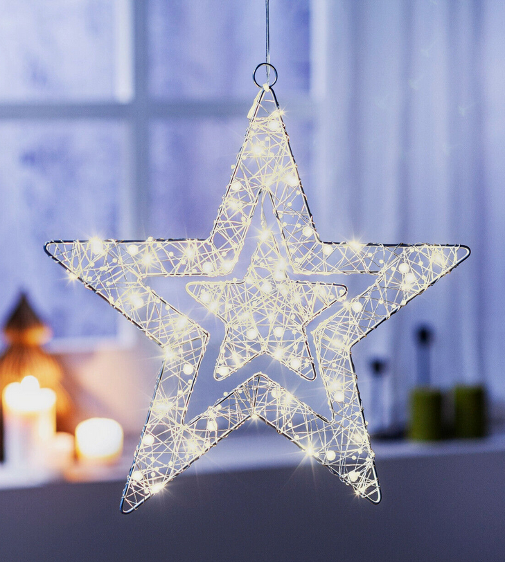 2 Sterne in einem, mit feinem Draht verbunden, Rahmen aus silberfarbenem Metall mit kreisrundem Aufhänger an der Spitze