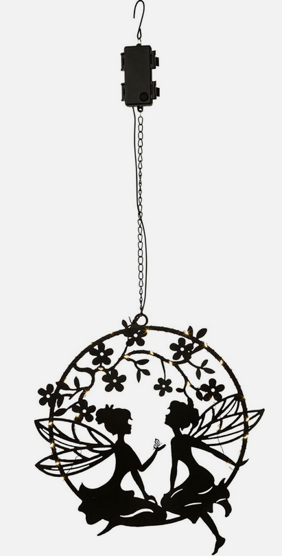aus Metall, schwarz, runder Rahmen, Feensilhouetten und Blütenzweige kunstvoll gestaltet im Scherenschnitt-Stil, beleuchtet mit 30 warmweissen LEDs, 6-Stunden-Timer, mit Outdoor-Batteriebox (für 2 x AA-Batterien, nicht enthalten)