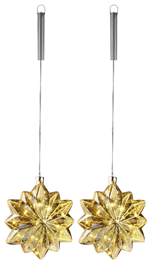 Diese Pracht-Schneeflocken beeindrucken bei Tag und am Abend – Sie und Ihre Familie, Ihre Gäste, Passanten … Die Stimmungsleuchten aus feinstem Glas sind zart bernsteinfarben getönt und dreidimensional ausgestaltet. So schmücken die beiden gläsernen Objekte in Ihrem Zuhause bereits untertags Fenster und Wände, sie baumeln von der Decke oder hängen lässig am Garderobenhaken. In den Abendstunden illuminiert warmweißes Licht die Hängedeko – einfach zauberhaft!