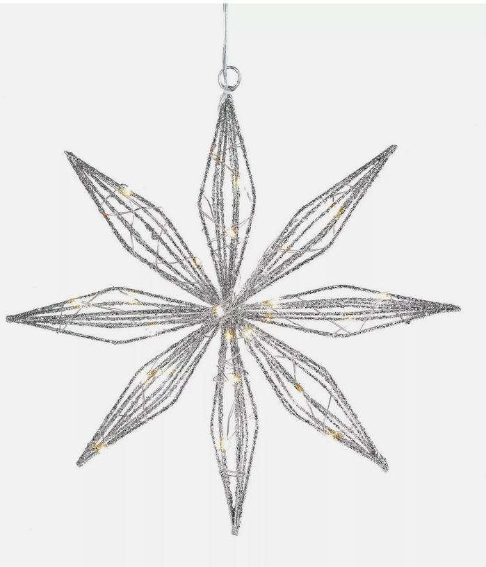 8 Zacken, bestehend aus silberfarbenen Metallstreben mit Glitter-Finish und Aufhängeöse aus Metall