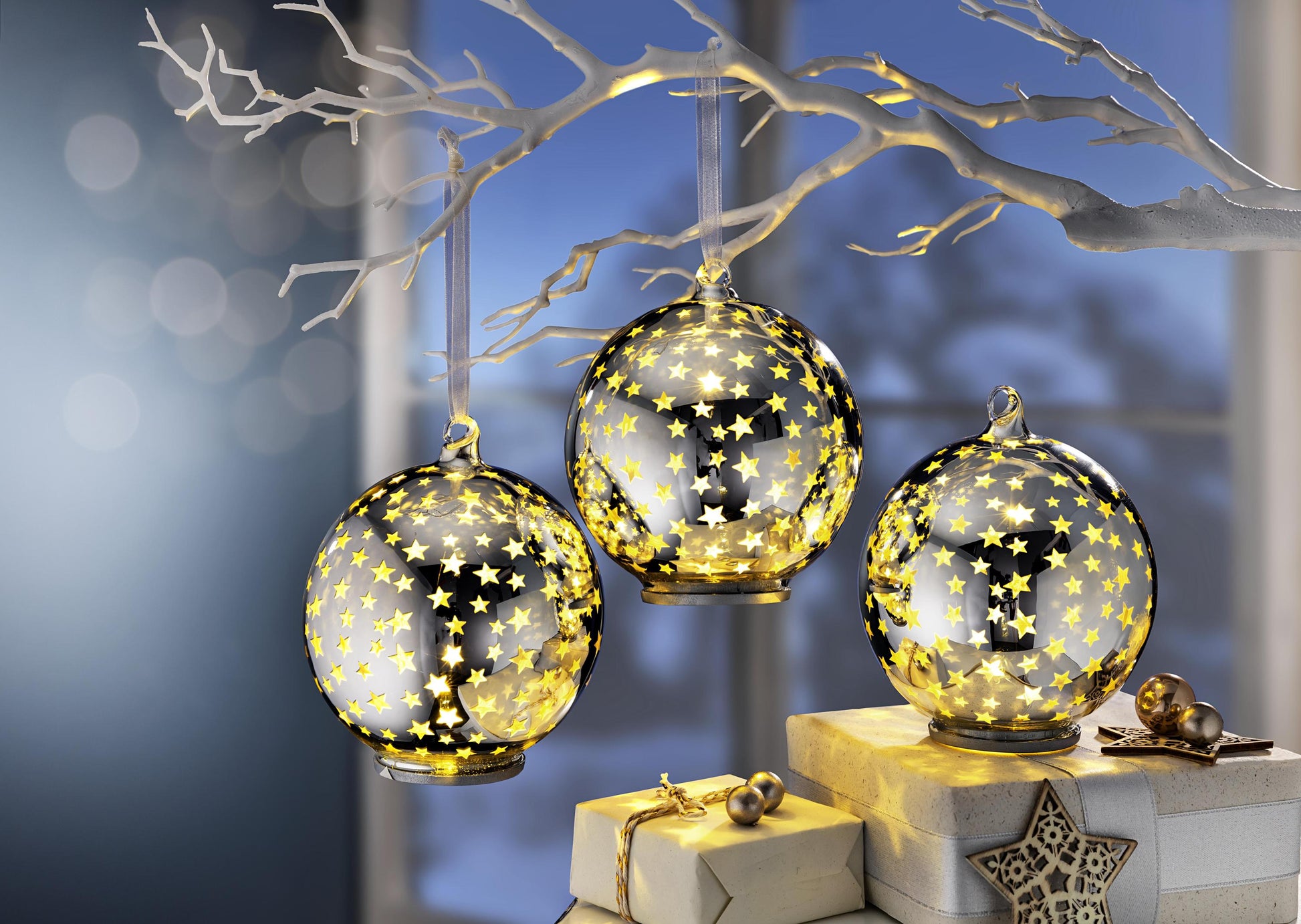 - Silberglänzende Glaskugeln mit goldenem Stimmungslicht