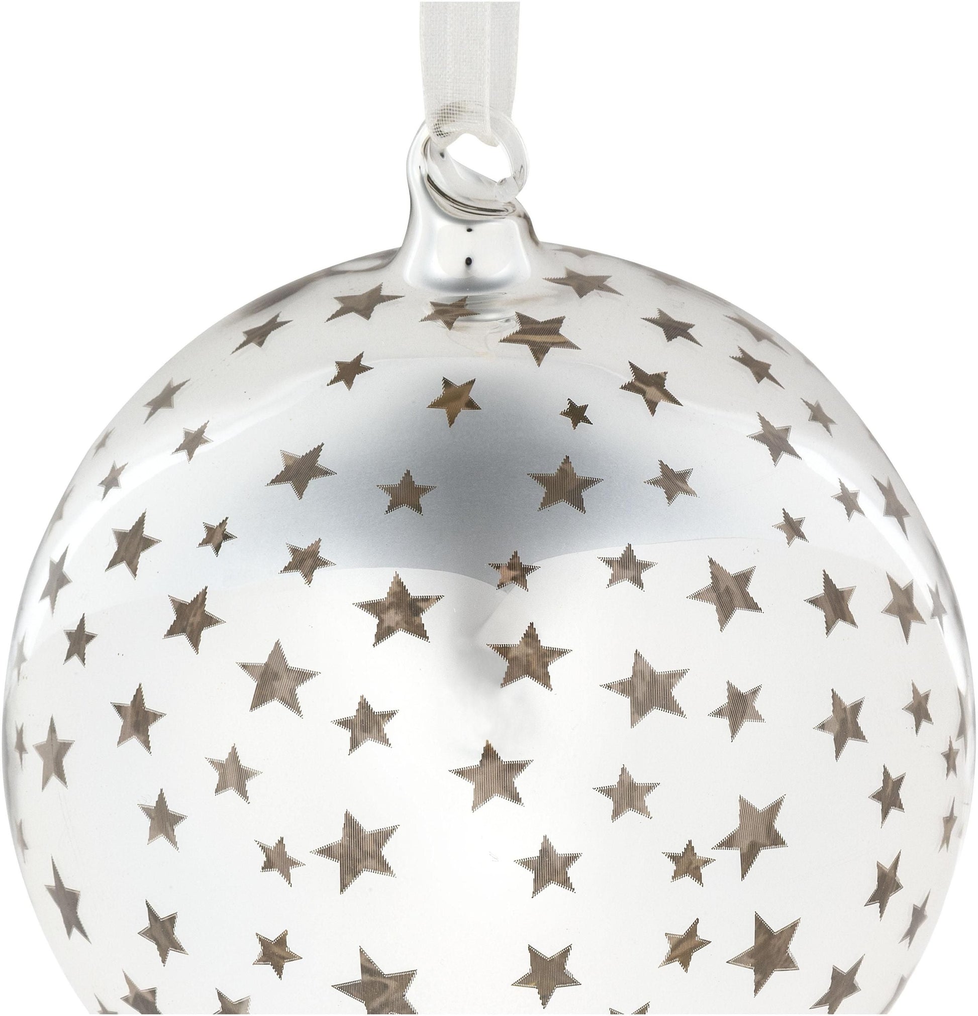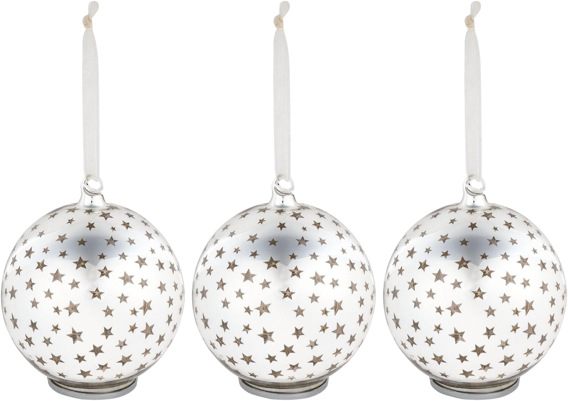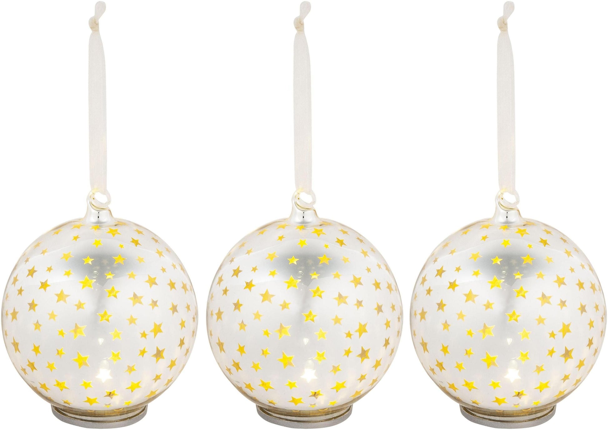 Die Glaskugeln mit Sternchen-Dekor glänzen spiegelblank in schickem Silber und sind damit bereits tagsüber attraktive Blickfänger. Bei eingeschalteter Beleuchtung strahlt goldenes Stimmungslicht durch die transparenten Sterne und sorgt in den Abendstunden für zauberhafte Licht-Effekte. Wenn die Kugeln in der Nähe einer Wand hängen, projizieren die Sterne sogar Sternchen darauf.