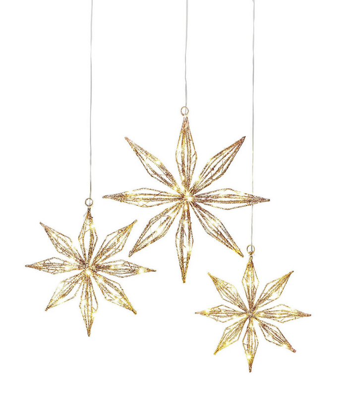 Die leuchtenden Sterne in 3 unterschiedlichen Grössen wirken wie Blumen. Sie sind aus roségoldfarbenem Metall gefertigt und kommen durch die schimmernde Oberfläche wunderbar zur Geltung. Insgesamt sind die Sterne mit 55 LEDs bestückt und verfügen jeweils über ein separates Batteriefach (3x AA-Batterien, nicht enthalten).