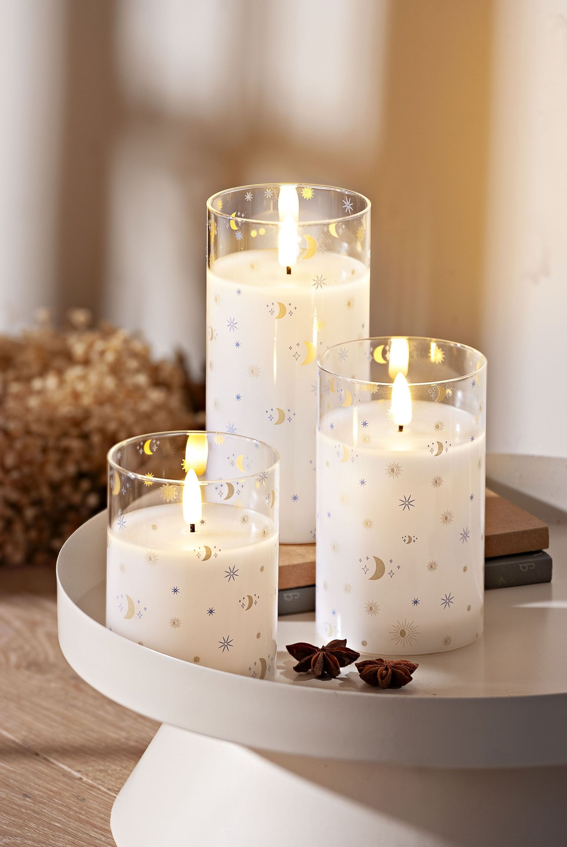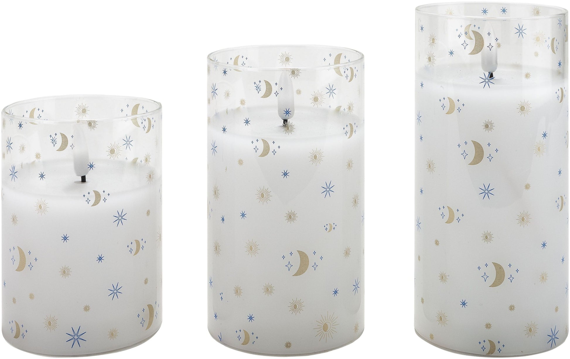 Selbst ohne Beleuchtung sind die drei LED-Kerzen „Sky“ attraktive Accessoires für Ihre Wohnung. Die Glasröhren schmücken sich rundherum mit Mond und Sternen, die Motive sind klein und fein, viele davon schimmern in edlem Gold.