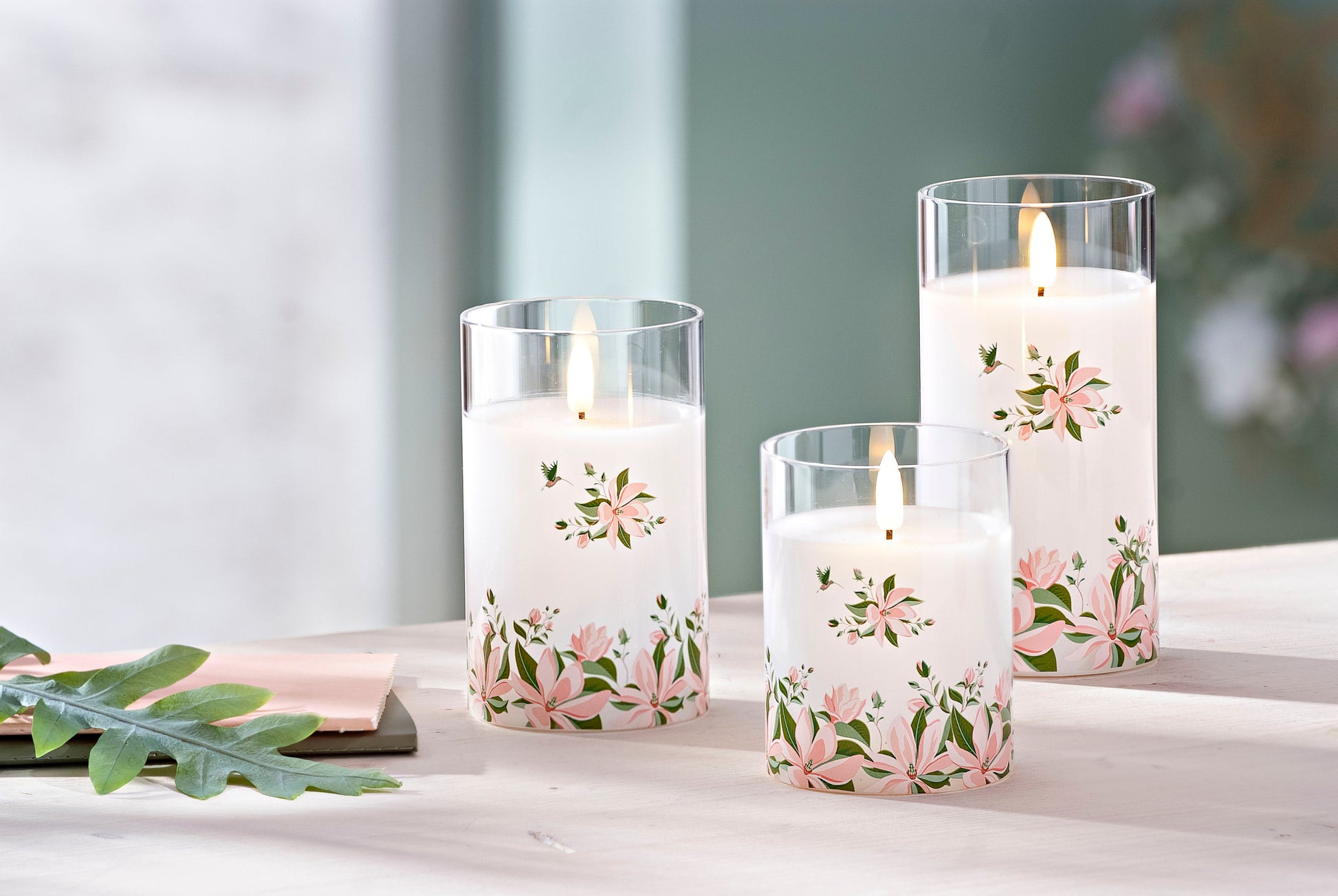 Magnolienblüten sind der Inbegriff von Eleganz und Grazie – als romantisches Dekor auf diesen wundervollen Kerzengläsern lassen Sie Ihr Zuhause traumhaftem Blütenzauber erstrahlen. Die zarten Rosatöne der noblen Magnolienblüten sind umrahmt von grünem Blattwerk, und ein filigrander Kolibri umschwirrt den Blütenzauber. Die drei Kerzengläser in abgestuften Größen wirken schon im Tageslicht wundervoll dekoartiv – aber am Abend, im Schein der gemütlich flackernden LED-Flamme, schlägt die große Stunde des Kerzentrios: Der weiße Echtwachskorpus wird erfüllt in und lässt die Magnolienblüten noch intensiver erstrahlen. Dank Timersteuerung können Sie das Leuchtschauspiel jeden Tag zur Wunschuhrzeit genießen: Die zart flackernden LED-Flammen schalten sich für jeweils 6 Stunden automatisch ein und wieder aus. So sind die Kerzen Tag und Nacht ein wundervoller Blickfang auf Sideboard, Fensterbank, Esstisch & Co!
