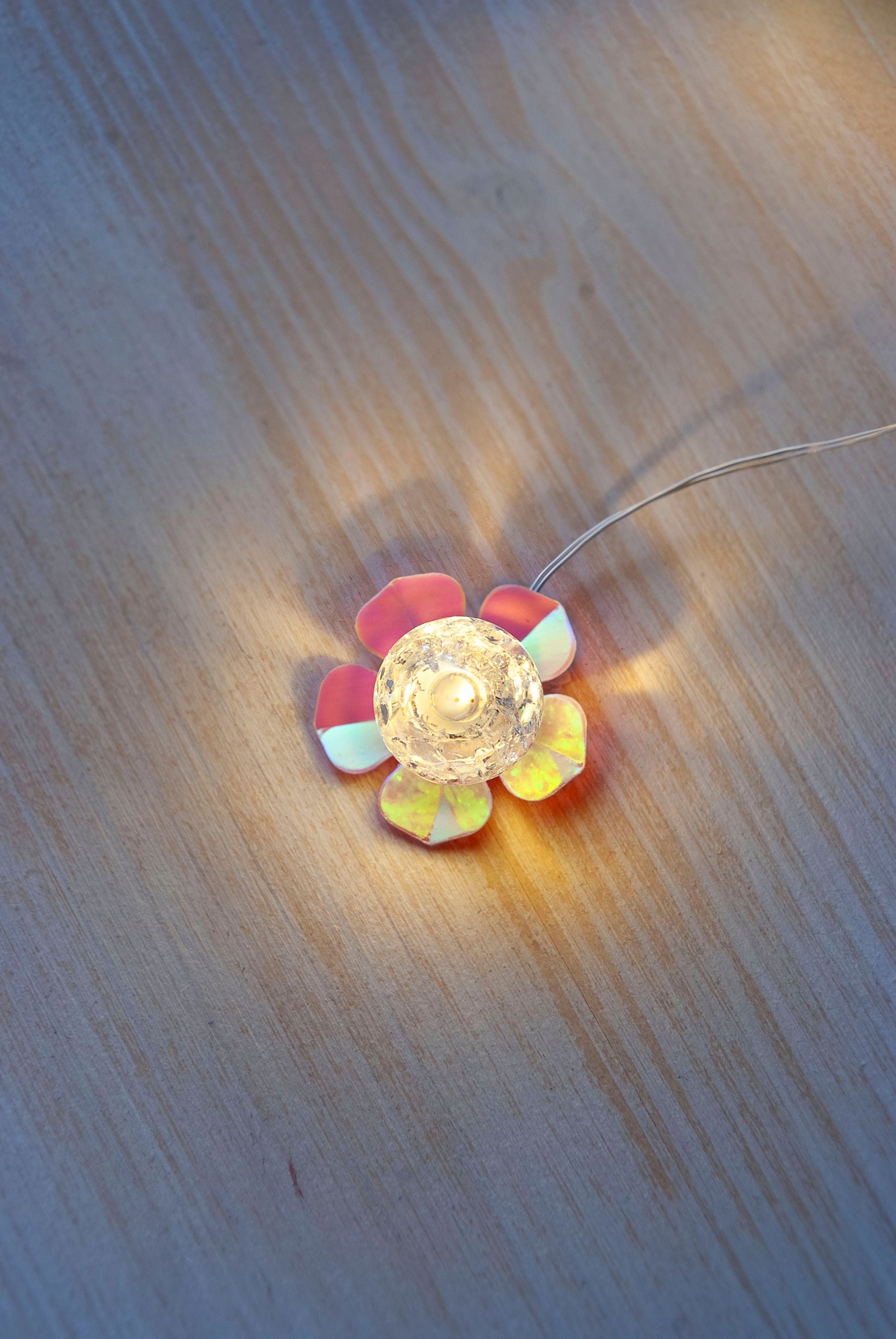 Bereits ohne Beleuchtung ist die Girlande eine Dekoration, die im Handumdrehen verspielte Akzente setzt. Ihre 20 kleinen Blumen bestechen durch fröhliche Farben, die dank irisierendem Finish zauberhaft schimmern. In der Mitte jeder Blüte sitzt eine transparente Kugel, die wie zartes Craqueléglas wirkt, jedoch schön robust ist. Bei eingeschaltetem Licht glitzern die haarfeinen Linien der Kugel golden im Schein der LED und sorgen für ein funkelndes Lichtspiel.