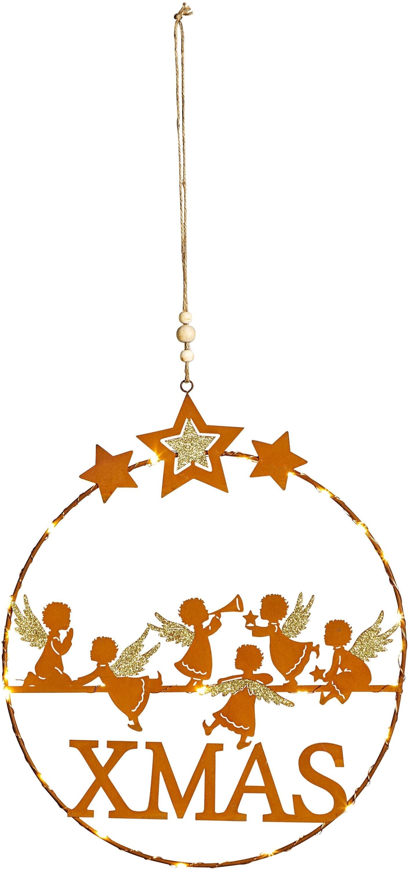 Lauter süße Himmelsboten tummeln sich hier in stimmungsvoller Runde. Die Engelchen klettern vom Schriftzug „XMAS“ auf eine kleine Bühne und proben vielleicht gerade für ein weihnachtliches Theaterstück … Auf jeden Fall sind sie entzückend anzusehen, ob bei Tag oder am Abend. Alle Figuren sind im Scherenschnitt-Stil gestaltet, ihre Flügelchen glitzern in festlichem Gold. Ein Metallring mit Sternendeko bildet einen schönen Rahmen für die Szenerie. Wenn es dunkel wird, illuminieren 25 warmweiße Lichter das Engelsspiel und wirken wie funkelnde Sterne. Auf Wunsch nimmt Ihnen der integrierte Timer sogar das Ein- und Ausschalten ab.