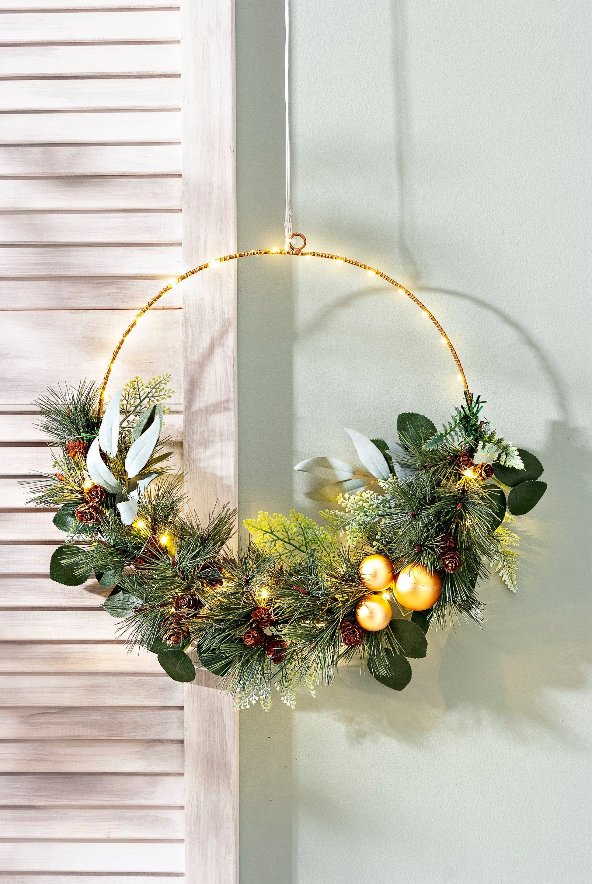 Eine Augenweide an Wand, Türe oder am Fenster. Der Lichterkranz verbreitet überall eine angenehme Atmosphäre. Untertags punktet er durch sein üppiges Grün. Wenn es dunkel wird, zeigt er sich dann in seiner ganzen Pracht mit festlichem Lichterglanz.