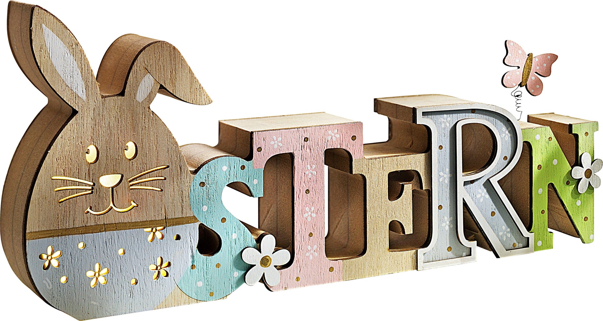 Selbst ohne Beleuchtung ist dieser Design-Schriftzug eine charmante Dekoration, auf Fensterbrett oder Kommode, auf dem schön gedeckten Ostertisch …