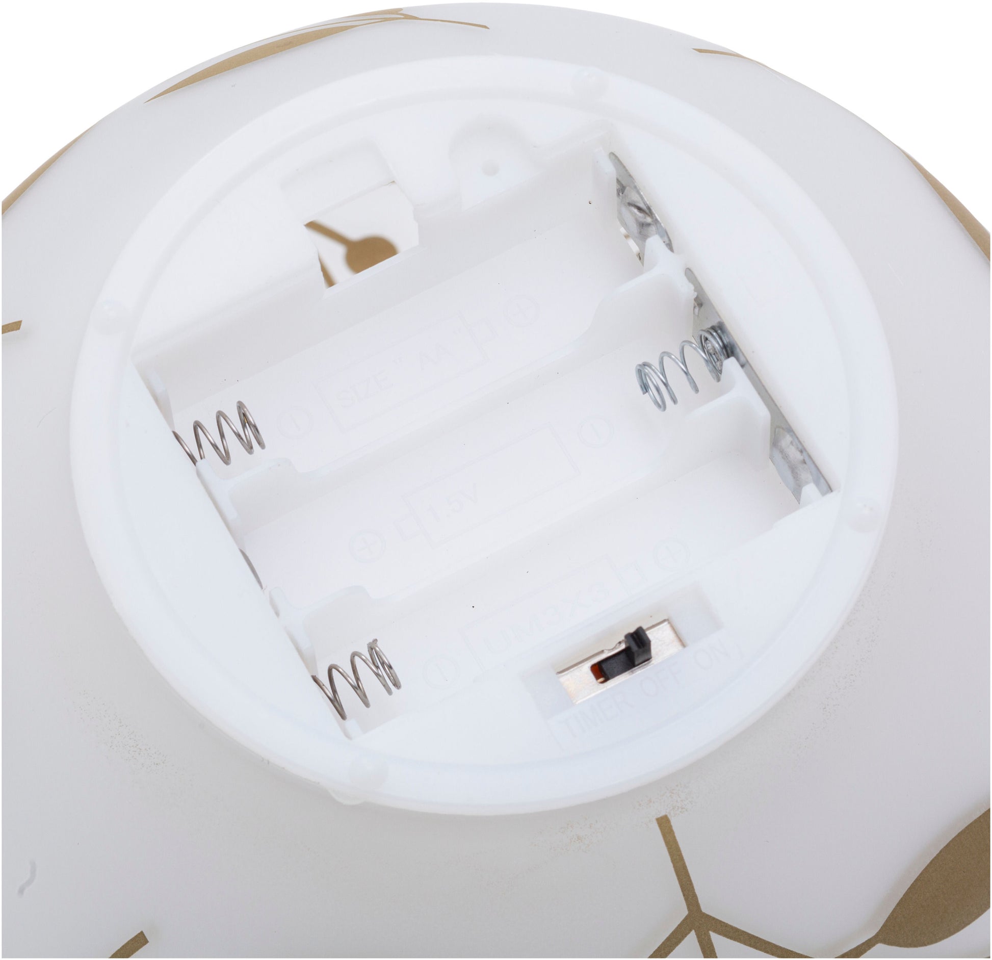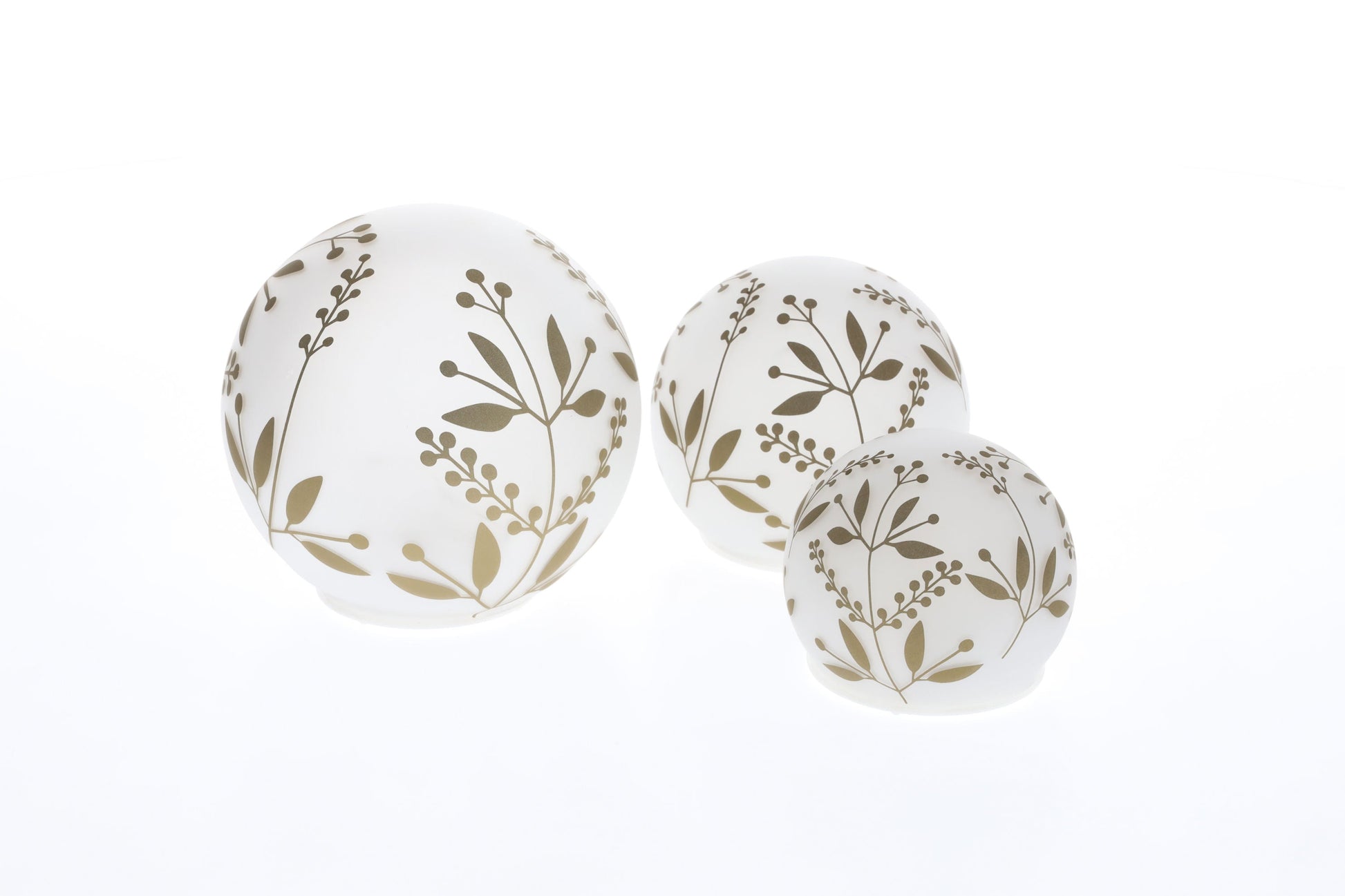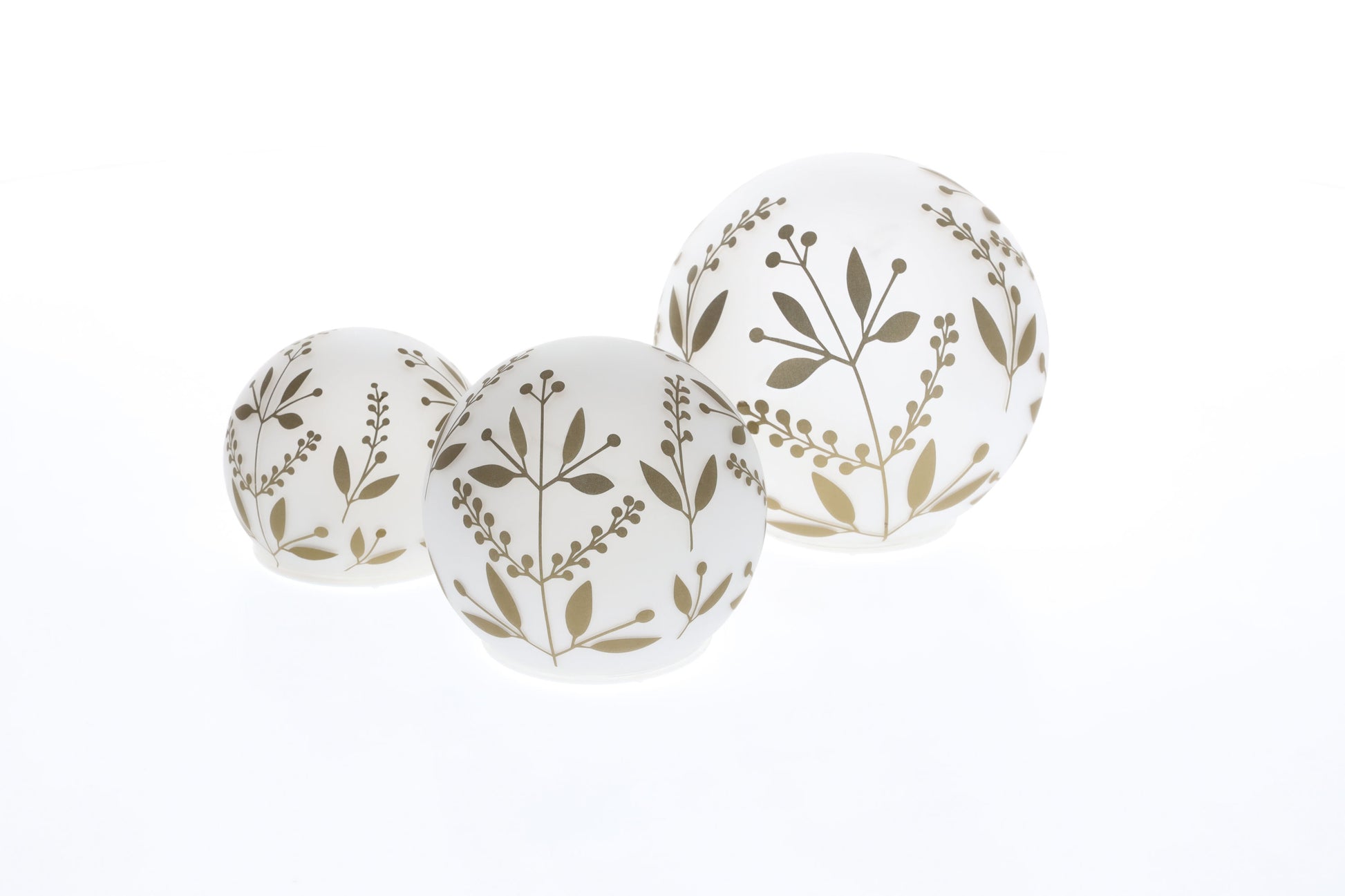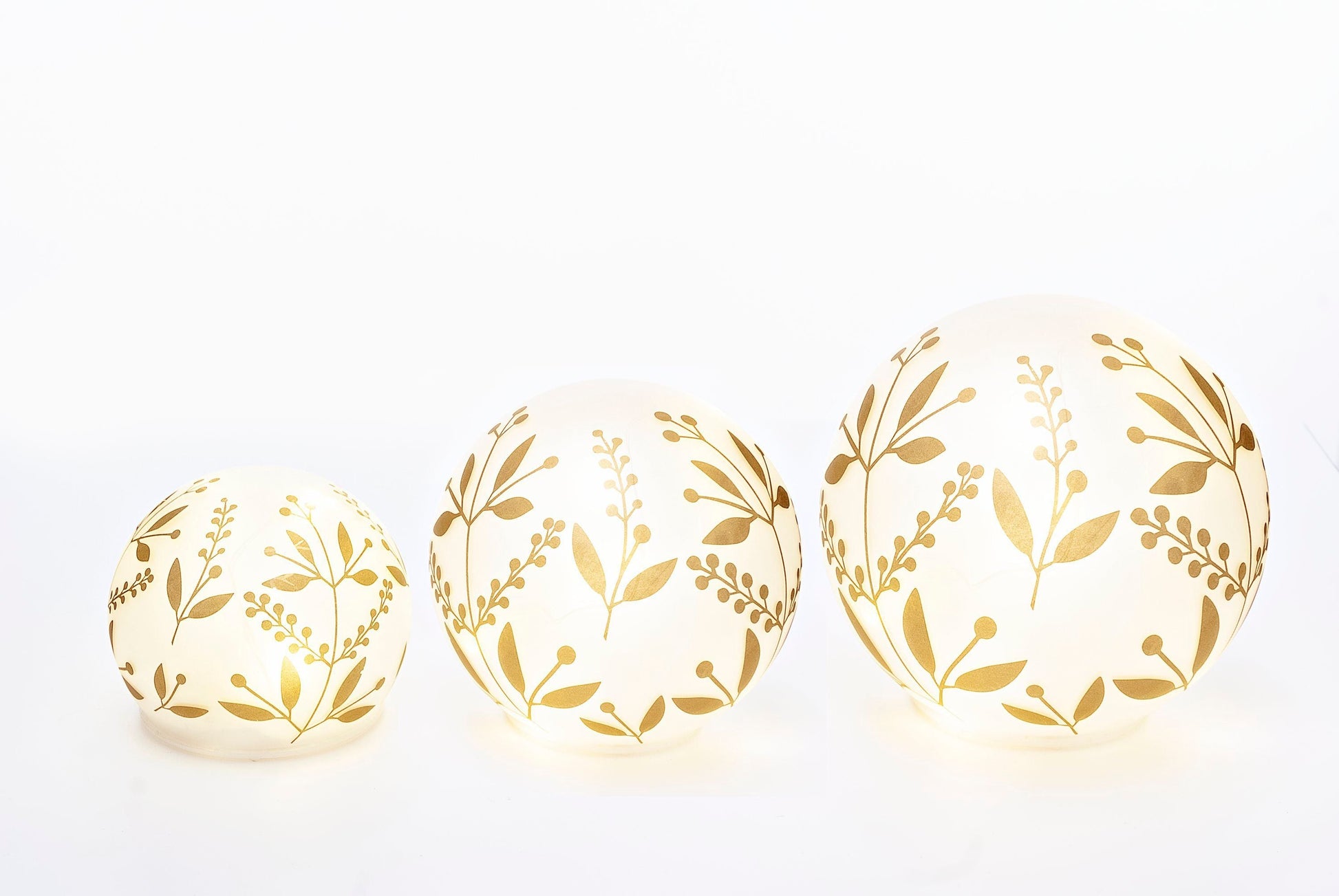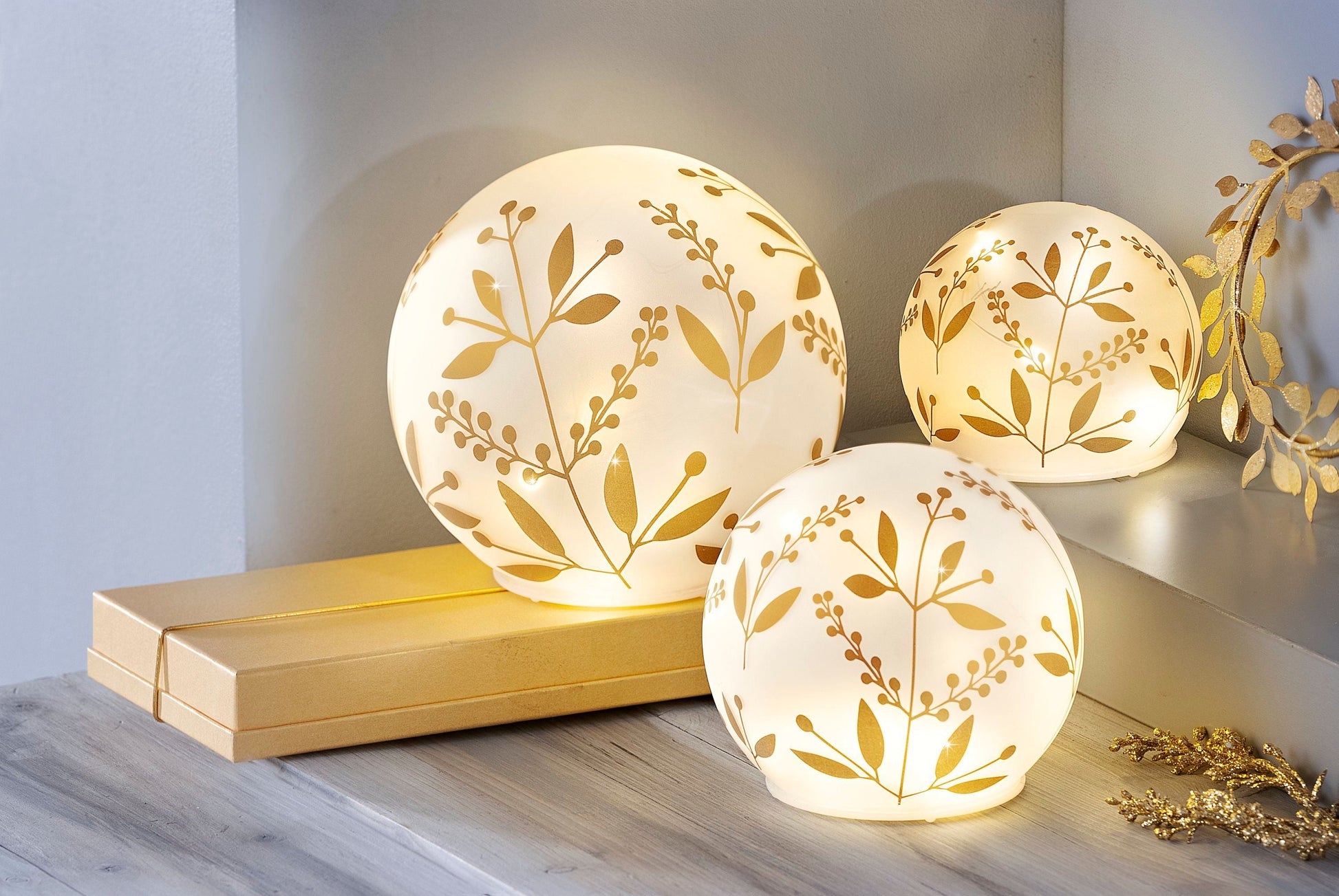 Die drei Glaskugeln sorgen bei Deko-Liebhabern für helle Freude, ob einzeln aufgestellt oder als Stimmungstrio. Jede Leuchte ist rundherum mit künstlerisch gestalteten Zweigen verziert, die in einem dezenten Goldton glänzen. Somit sind diese edlen Kugeln auch ohne Beleuchtung schicke Blickfänger auf dem Fensterbrett, auf Sideboard, Regal …