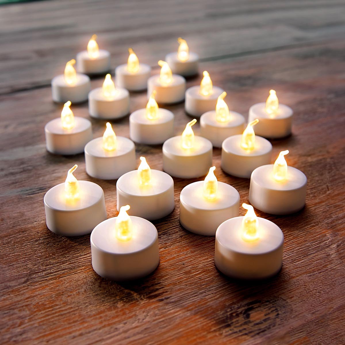 LED-Deko-Teelichtkerzen mit gelb-orangem Licht, flackernder Effekt, der eine echte Flamme imitiert. Das gemütliche Ambiente echter Kerzen ohne Brandgefahr: ideal für Haushalte mit Kindern und Haustieren.