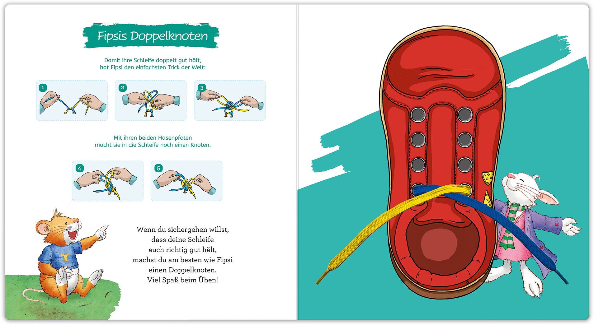 Klettverschlüsse sind praktisch. Aber der Anreiz, die Schleife zu lernen ist damit nicht gross. Dabei gibt einem die Schleife zu können ein Stück Selbstständigkeit und ein Erfolgserlebnis. Aber nicht nur das: Schleifen binden fördert auch die Augen-Hand-Koordination und ist für die Entwicklung des Kindes wichtig. In vier neuen Geschichten aus Leos Alltag werden kleine Lausemaus-Fans mit diesem Lernbuch spielerisch an das Thema Schleifen binden herangeführt. Einfache Schnüranleitungen mit lustigen Merksprüchen und ein liebevoll illustrierter Schuh mit echten Löchern und Schnüren laden dabei zum Ausprobieren und Üben ein. So wird Schleifen binden zum Kinderspiel!