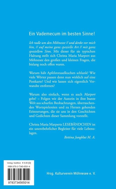 Im LESEBÄNDCHEN folgen wir der Autorin in ihre bunte Welt aus scharfen Beobachtungen, überraschenden Wortspielereien und zu Herzen gehenden Erinnerungen, die sie uns in Geschichten, Gedichten und satirischen Texten vorstellt. In ihrer Sammlung spürt die Autorin auf scharfsinnig-unterhaltsame Weise große und kleine Fragen auf, die bislang noch auf Antwort warteten: Warum hält Apfelstreuselkuchen schlank? Wie viele Wörter passen denn nun wirklich auf eine Postkarte? Und wie lassen sich eigentlich Verwandte entfernen? Ein Buch zum Verschenken und Selberlesen für Menschen, die von leichter Hand geschriebene Texte mit Tiefgang suchen.