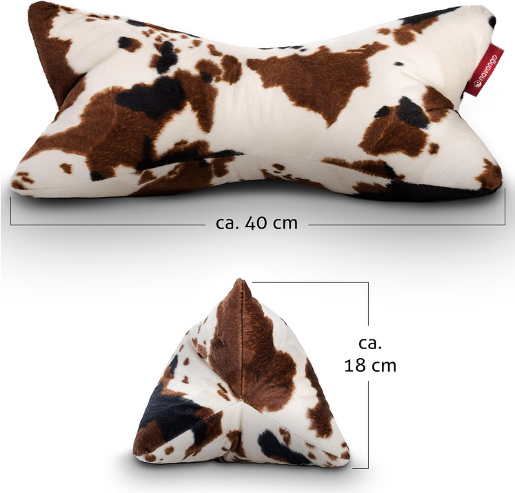 Das Muster des Lesekissen ist mit Kuhflecken versehen und macht das Reisekissen damit zu einem echten Hingucker, der besonders für Tierliebhaber und Kinder geeignet ist.