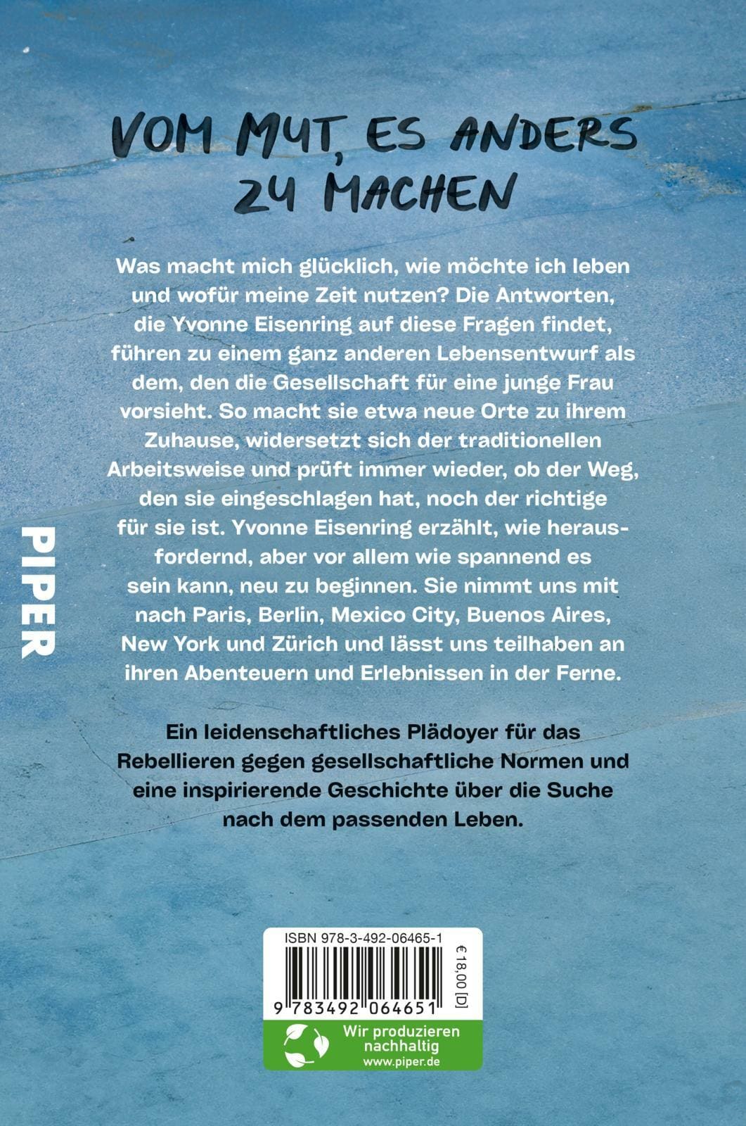 Vom Mut, es anders zu machenWas macht mich glücklich, wie möchte ich leben und wofür meine Zeit nutzen? Die Antworten, die Yvonne Eisenring auf diese Fragen findet, führen zu einem ganz anderen Lebensentwurf als dem, den die Gesellschaft für eine junge Frau vorsieht. So macht sie etwa neue Orte zu ihrem Zuhause, widersetzt sich der traditionellen Arbeitsweise und prüft immer wieder, ob der Weg, den sie eingeschlagen hat, noch der richtige für sie ist. Yvonne Eisenring erzählt, wie herausfordernd, aber vor allem wie spannend es sein kann, neu zu beginnen. Sie nimmt uns mit nach Paris, Berlin, Mexico City, Buenos Aires, New York und Zürich und lässt uns teilhaben an ihren Abenteuern und Erlebnissen in der Ferne.