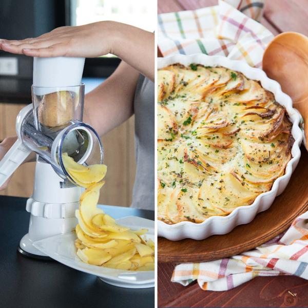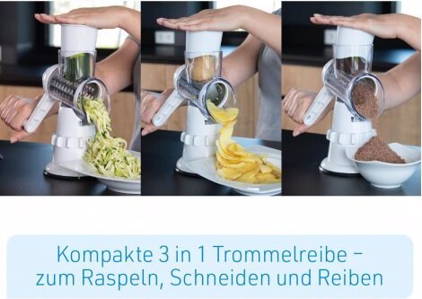 Vergessen Sie matschige, zerhackte Lebensmittel aus sperrigen Küchengeräten oder Küchenmaschinen, die Ihnen viel Patz in der Küche wegnehmen. Der Livington Sumo Slicer schneidet, raspelt und reibt im Handumdrehen und bis zu 18 Mal schneller köstliche, gesunde Mahlzeiten für die ganze Familie. Der Sumo Slicer kombiniert die Vielseitigkeit und Präzision von Messern mit der Geschwindigkeit einer Küchenmaschine. Ausserdem benötigt der Sumo Slicer nur minimal Platz und vereinfacht Ihnen die Arbeit dennoch enorm. Das Geheimnis liegt in den ultrascharfen, austauschbaren Edelstahlklingen. Damit raspeln, schneiden und reiben Sie bis zu 18 Mal schneller als bisher. Sumo Slicer saugt sich an jede glatte Oberfläche perfekt an und hält bombenfest. Fixieren Sie Sumo auf einer glatten Oberfläche und schneiden, raspeln und reiben Sie direkt in Ihre Schüssel. Schneiden Sie Zwiebel ohne eine Träne, Pilze für köstliche Suppen oder Paprika für Ihre Pizza. Wechseln Sie die Edelstahlklinge auf die grobe Reibe und kurbeln Sie mühelos einen Berg herrlichen Käse, Kartoffeln für lecker Reibekuchen oder zaubern Sie perfekte Salate. Bereiten Sie herrliche Zucchini-Pasta, köstliche Süsskartoffelchips und eigenes Paniermehl zu. Und wenn Sie fertig sind - einfach Fixierfunktion öffnen und unter fliessendem Wasser reinigen oder ganz einfach in die Spülmaschine geben. Mit dem Livington Sumo Slicer sind Ihnen ab sofort in Ihrer Küche keine Grenzen gesetzt.