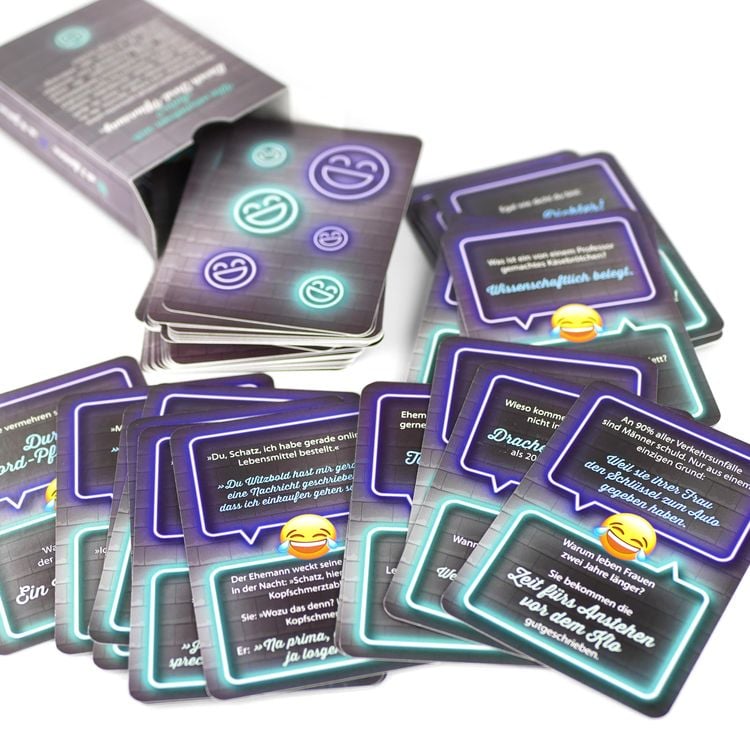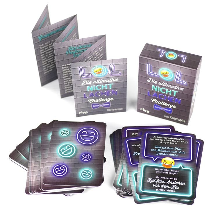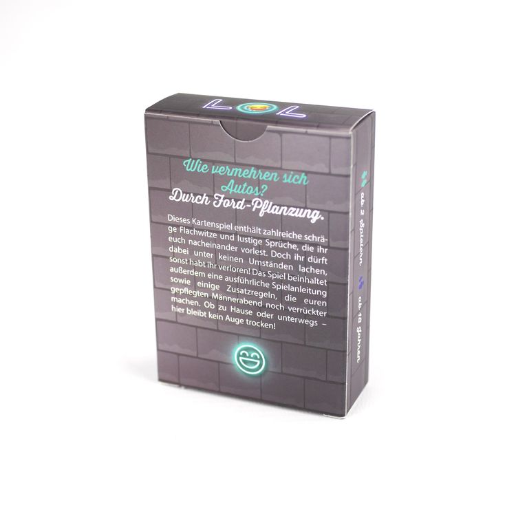 Es ist ganz einfach, bei Witzen nicht laut loszulachen? Fehlanzeige! Nur wer diszipliniert genug ist, kann bei diesem Spiel punkten. LOL – Die ultimative Nicht-lachen-Challenge – Edition für Männer enthält zahlreiche schräge Flachwitze und lustige Sprüche. Doch wer eine Miene verzieht, verliert! Dieses Kartenspiel enthält neben einer großen Auswahl an Witzen extra für Männer eine ausführliche Spielanleitung sowie einige Zusatzregeln, die einen gepflegten Männerabend noch verrückter machen. Ob zu Hause oder unterwegs – hier bleibt kein Auge trocken!