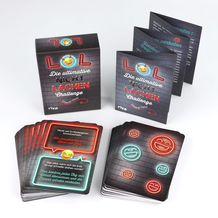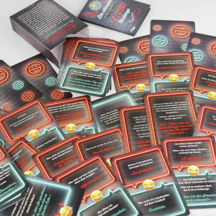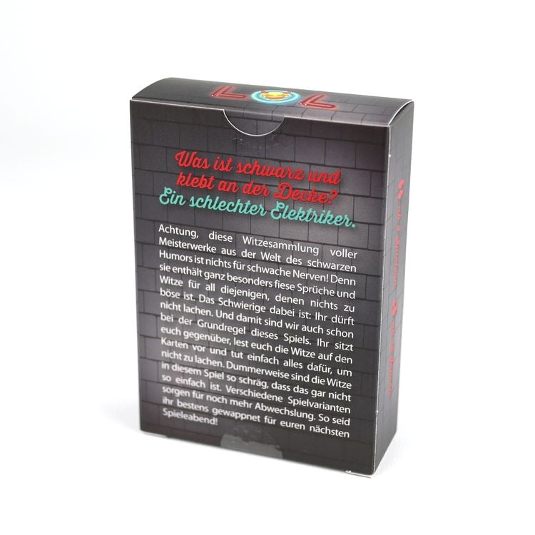 Was ist schwarz und klebt an der Decke? Ein schlechter Elektriker. Achtung, diese Witzesammlung voller Meisterwerke aus der Welt des schwarzen Humors ist nichts für schwache Nerven! Denn sie enthält ganz besonders fiese Sprüche und Witze für all diejenigen, denen nichts zu böse ist. Das Schwierige dabei ist: Ihr dürft nicht lachen. Und damit sind wir auch schon bei der Grundregel dieses Spiels. Ihr sitzt euch gegenüber, lest euch die Witze auf den Karten vor und tut einfach alles dafür, um nicht zu lachen. Dummerweise sind die Witze in diesem Spiel so schräg, dass das gar nicht so einfach ist. Verschiedene Spielvarianten sorgen für noch mehr Abwechslung. So seid ihr bestens gewappnet für euren nächsten Spieleabend!