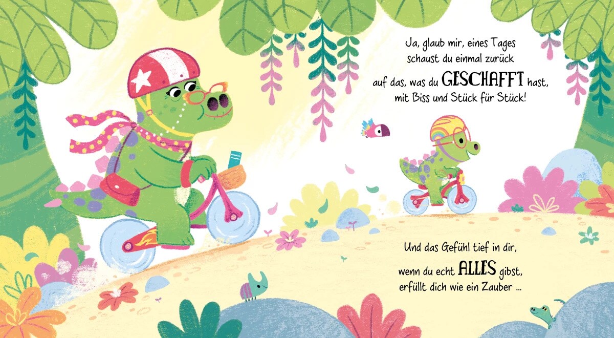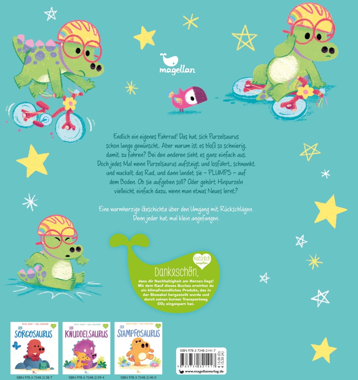 Da kommt Omasaurus angeradelt. Sie erinnert sich noch gut an die Zeit, als sie selbst ein kleiner Purzelsaurus war. Und sie weiß: Ohne Hinpurzeln geht es nicht, wichtig ist nur, dass man wieder aufsteht und es noch mal versucht!
