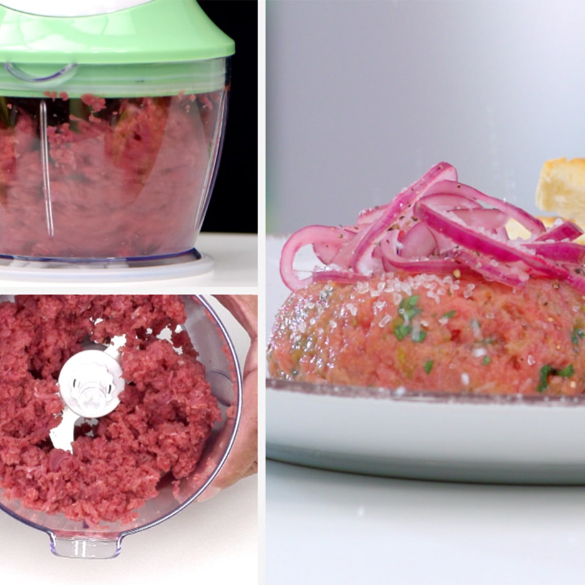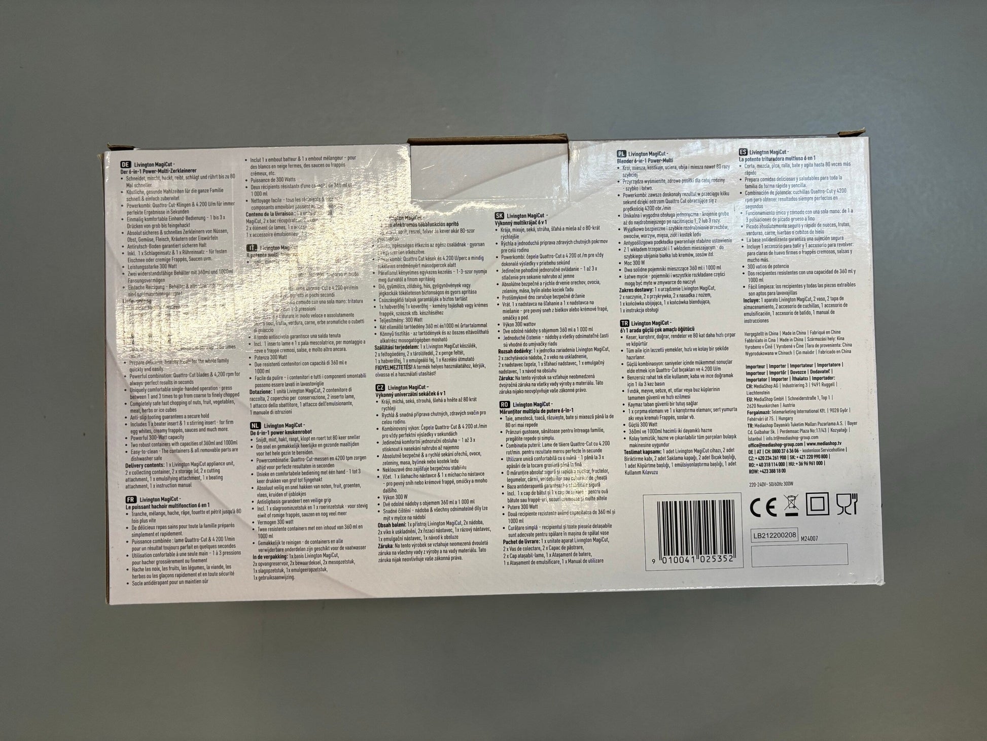Das Originial aus dem TV. Magi Cut schneidet, mischt, hackt, reibt, schlägt und rührt bis zu 80 Mal schneller - für kästliche, gesunde Mahlzeiten für die ganze Familie. Schnell und einfach zubereitet. Damit schneiden, reiben und hacken Sie bis zu 80 Mal schneller als bisher. Nur Livington Magi Cut schneidet souverän dank der einzigartigen Quattro-Cut-Klingen und bietet Ihnen die einmalig komfortable Einhand-Bedienung. Motor einfach aufsetzen und auf Knopfdruck geht es los.Gönnen Sie sich zum Start in den Tag einen erfrischenden Ingwer-Shot. Zerkleinern Sie hochwertiges Rindfleisch für das beste und schnellste Beef Tartar aller Zeiten. Kriegen Sie harte Nüsse in Sekunden klein und geniessen Sie köstliche Nusspfannkuchen. Aus ein paar gefrorenen Früchten und Joghurt macht Magi Cut superschnelles, unwiderstehlich cremiges Eis ohne Kalorien. Wechseln Sie auf den Schlageinsatz und machen Sie in null Komma nichts herrlich cremige Schlagsahne. Magi Cut ist auch ideal für die Zubereitung von Babynahrung, aus frischen Zutaten, denen Sie zu hundert Prozent vertrauen. Ihr Kind wird es lieben. Dank der praktischen Einhand-Bedienung drücken Sie einmal kurz für grob Geschnittenes, zweimal für mittelgrosse Stückchen oder dreimal: und schon ist alles perfekt klein gehackt. Magi Cut macht Spass beim Kochen. Magi Cut macht Lust auf Essen. Lieferumfang: 1x Livington Magi Cut, 2x Auffangbehälter (360 ml und 1000 ml), 2x Aufbewahrungsdeckel, 1x Klingeneinsatz für 360 ml Behälter, 1x Klingeneinsatz für 1000 ml Behälter, 2x Zusatzmesser für Klingeneinsatz, 1x Schlageinsatz, 1x Rühreinsatz, 1x Bedienungsanleitung.