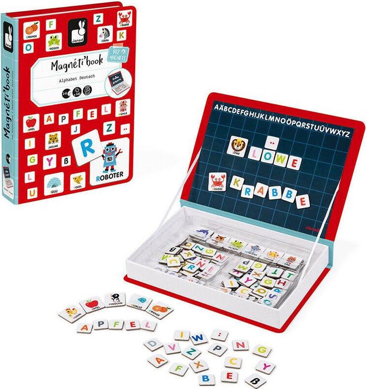 Edukatives Spielzeug aus Karton, um das Alphabet zu lernen.Ein 112-teiliges Buchstabenset in bunten Farben und im hochwertigen Klappkarton verpackt. Es besteht aus 26 bunten Magnetbildern, die zeigen, welche Wörter gelegt werden sollen. Dadurch wird spielerisch das Alphabet geschult und die Vorstellungskraft und Kreativität Ihres Kindes gefördert. Die praktische Aufbewahrungsbox erlaubt einen leichten und bequemen Transport, so dass Ihr Kind sein Lieblingsspielzeug überall hin mitnehmen kann.