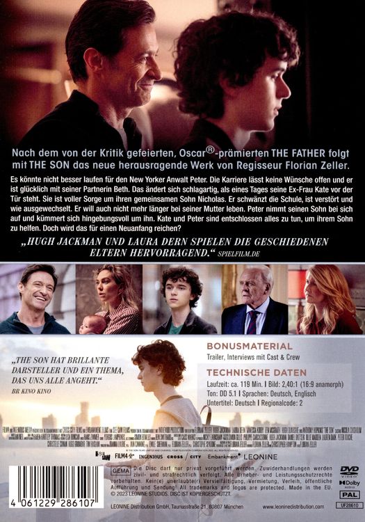 Nach dem von der Kritik gefeierten, Oscar®-prämierten "The Father" folgt mit THE SON das neue herausragende Werk von Regisseur Florian Zeller. Es könnte nicht besser laufen für den New Yorker Anwalt Peter (Hugh Jackman). Die Karriere lässt keine Wünsche offen und er ist glücklich mit seiner Partnerin Beth (Vanessa Kirby). Das ändert sich schlagartig, als eines Tages seine Ex-Frau Kate (Laura Dern) vor der Tür steht. Sie ist voller Sorge um ihren gemeinsamen Sohn Nicholas (Zen McGrath). Er schwänzt die Schule, ist verstört und wie ausgewechselt. Er will auch nicht mehr länger bei seiner Mutter leben. Peter nimmt seinen Sohn bei sich auf und kümmert sich hingebungsvoll um ihn. Kate und Peter sind entschlossen alles zu tun, um ihrem Sohn zu helfen. Doch wird das für einen Neuanfang reichen? Pressezitat: - "Florian Zeller ist schnell einer der aufregendsten visuellen Geschichtenerzähler geworden" - (VARIETY) - "Hugh Jackman ist niederschmetternd, womöglich seine beste dramatische Leistung bislang" - (SLASH FILM) - "Hugh Jackman und Laura Dern spielen die geschiedenen Eltern hervorragend!" - (Spielfilm.de) - "THE SON hat brillante Darsteller und ein Thema, das uns alle angeht" - (BR Kino Kino)