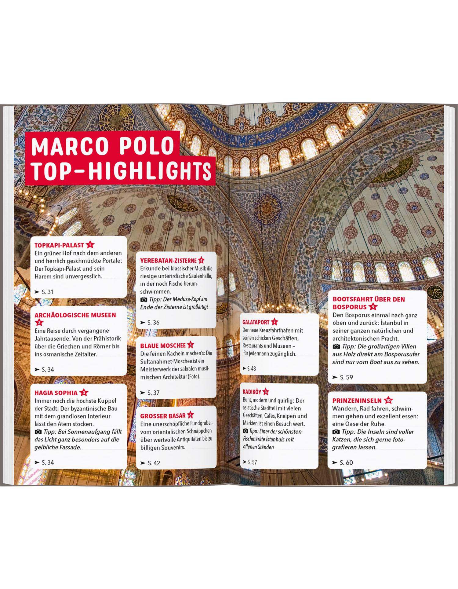 In deinem MARCO POLO Reiseführer für Istanbul findest du Wissenswertes zu Stadt und Kultur, Tipps für Übernachtungen und Restaurants sowie Infos zur Anreise und zum ÖPNV. Vor Ort stellst du dir mit dem Metroplan, den komplett überarbeiteten Highlight-Karten