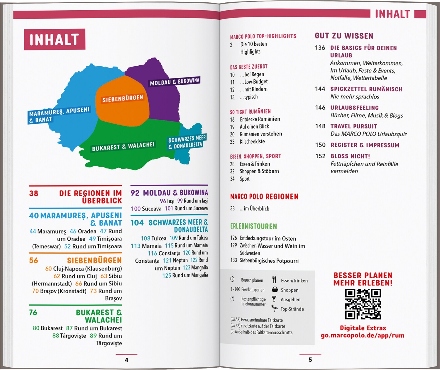 Ausgetretene Touristenpfade sind für die anderen - dieses Land ist für Entdecker! Kraxle über die Ruinen der alten Römer in Sarmizegetusa, fahre untertage Riesenrad im ehemaligen Salzbergwerk von Turda und paddle im Donaudelta mit Pelikanen um die Wette. In den Bars und Clubs in Bukarests Altstadt lernst du die Einheimischen kennen und feierst mit ihnen bis in den Morgen. Ob Abenteurer, Naturgenießer oder Party People - mit dem MARCO POLO Reiseführer wird dein Rumänien-Urlaub unvergesslich!