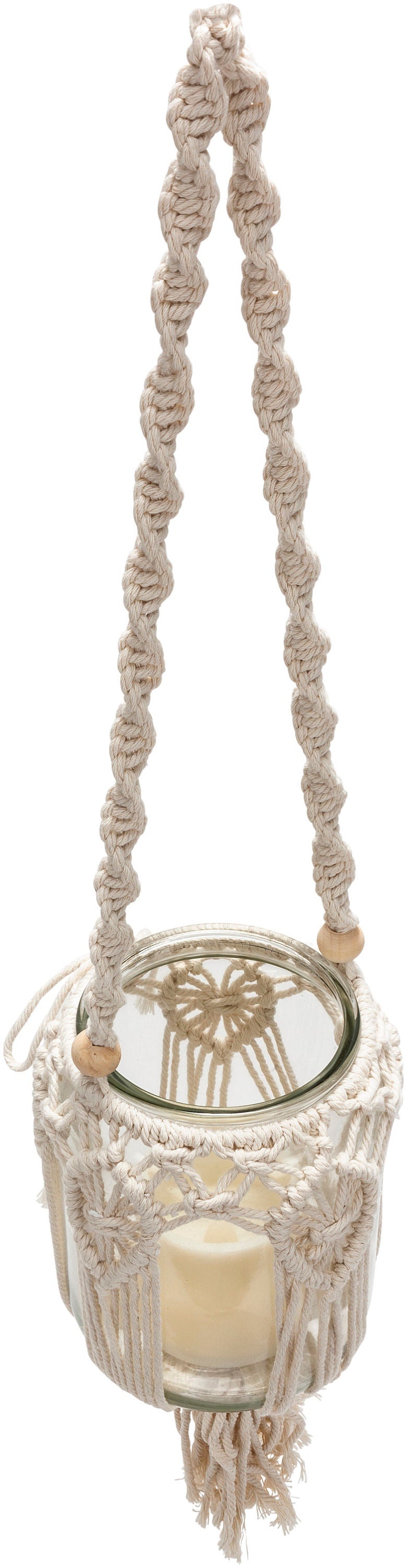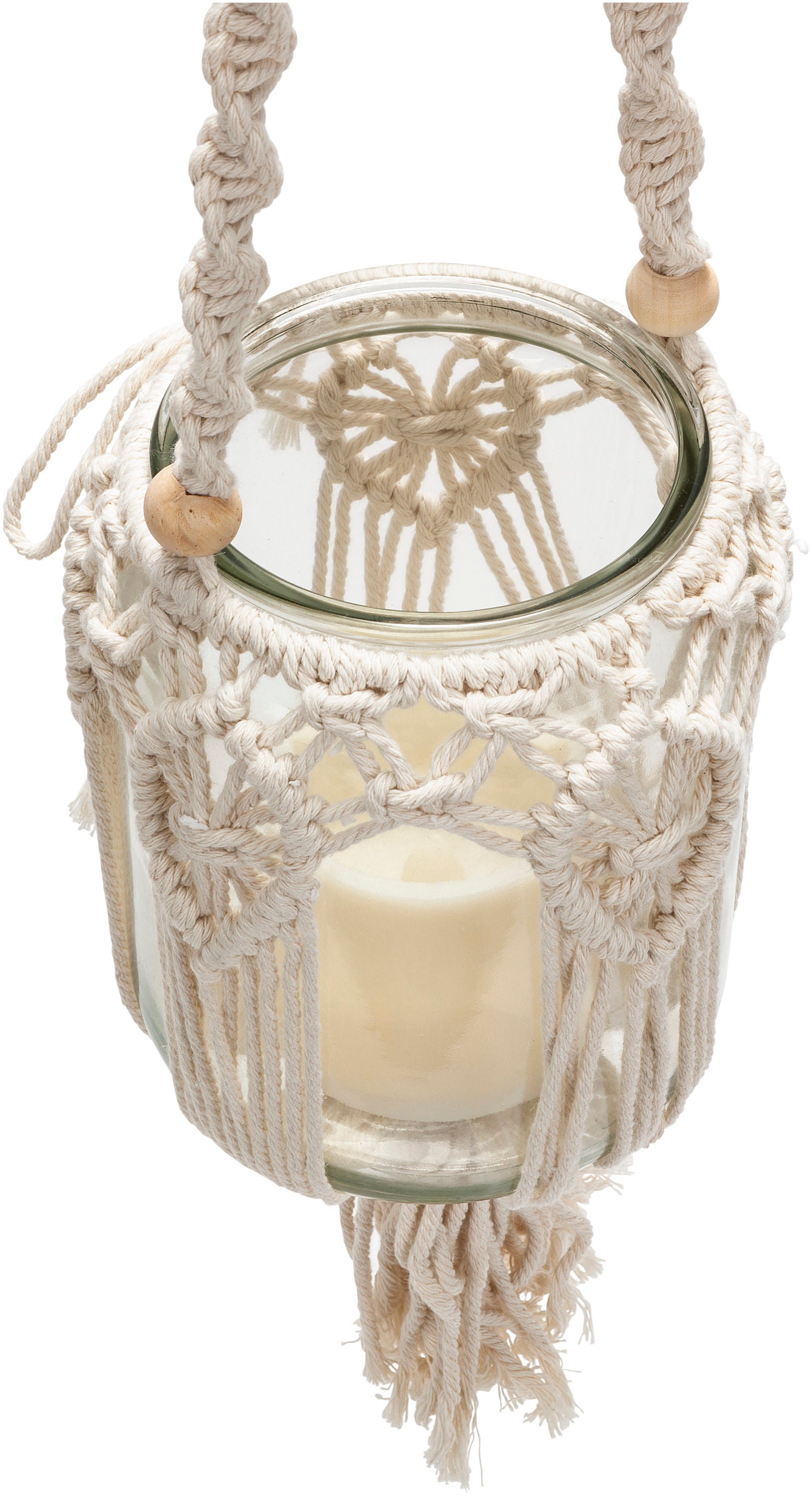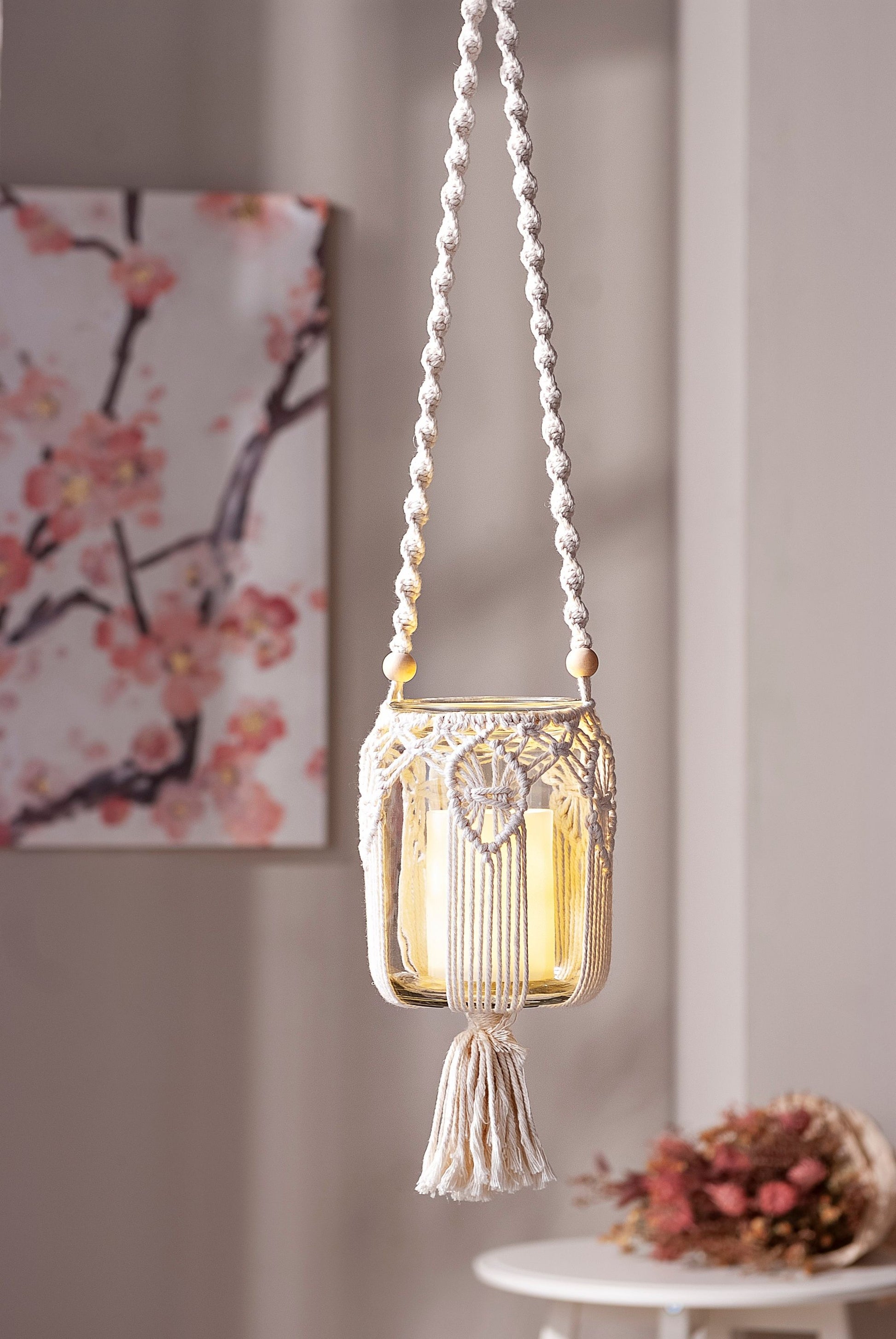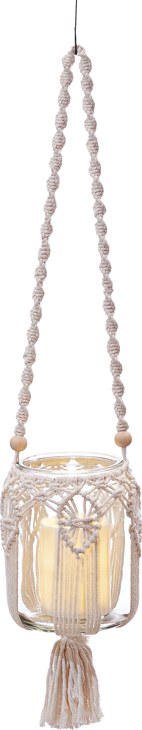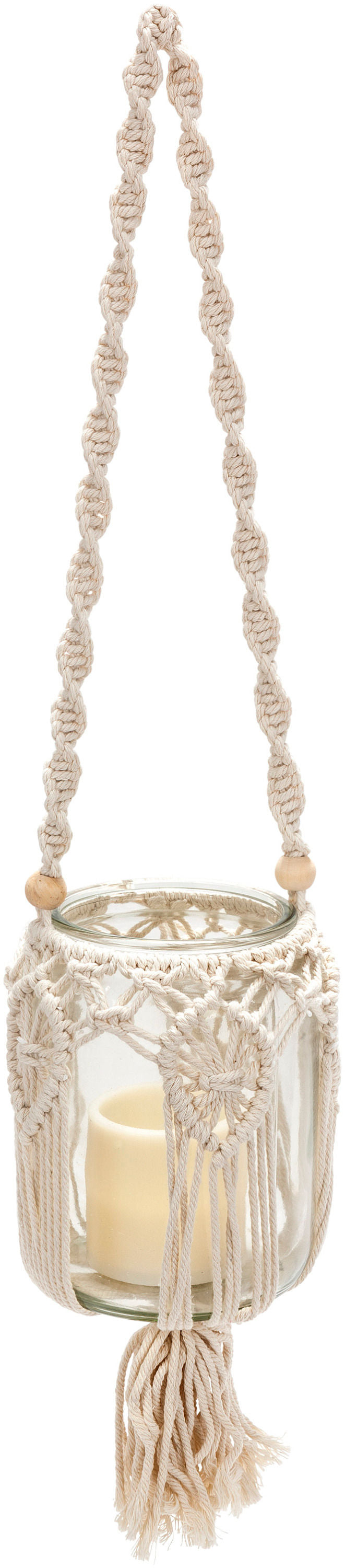 Ein Schmuckstück für Ihre vier Wände. Das kunstvoll gearbeitete Makramee-Windlicht mit LED-Kerze sorgt für eine behagliche Atmosphäre in Ihrem Zuhause.