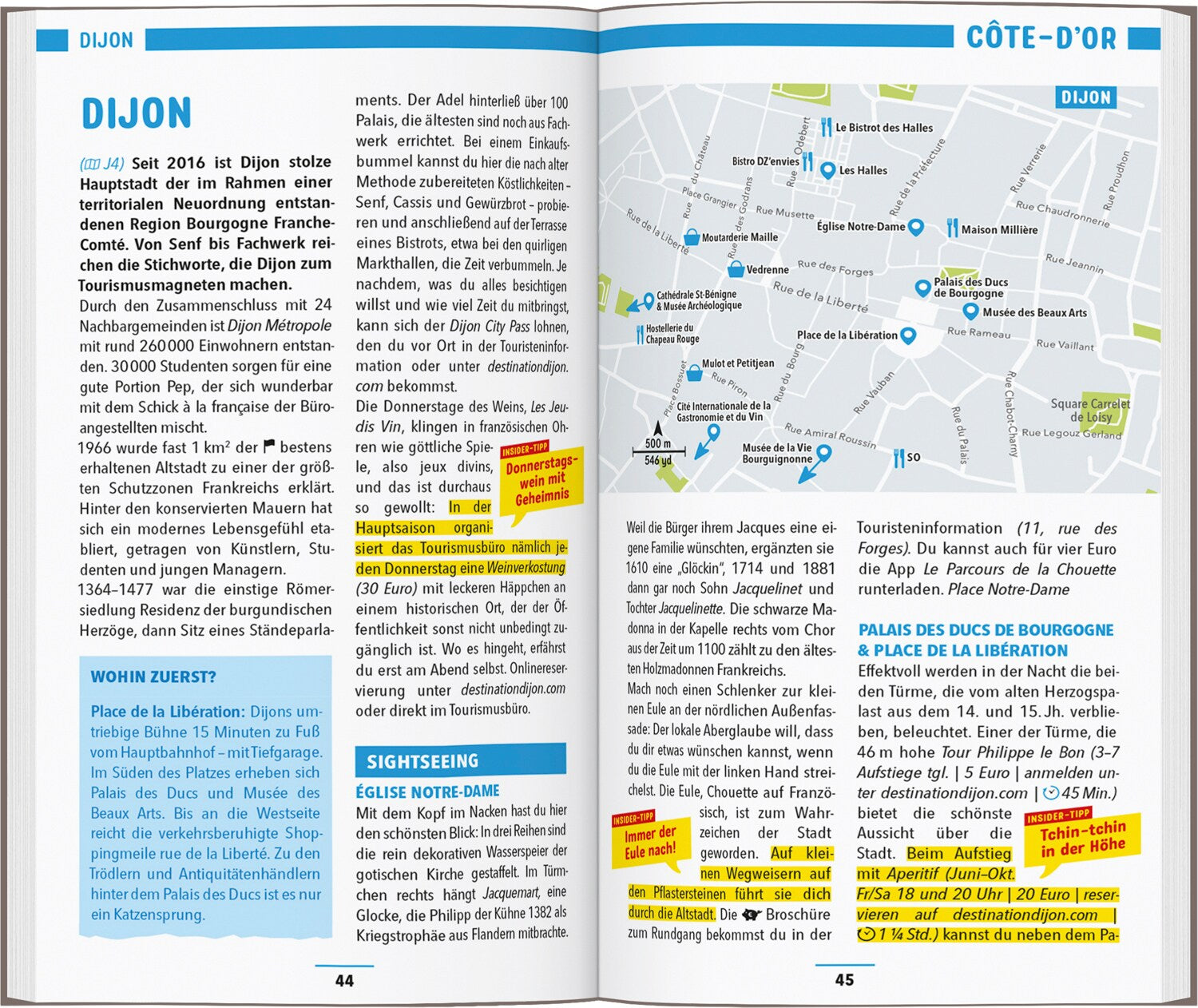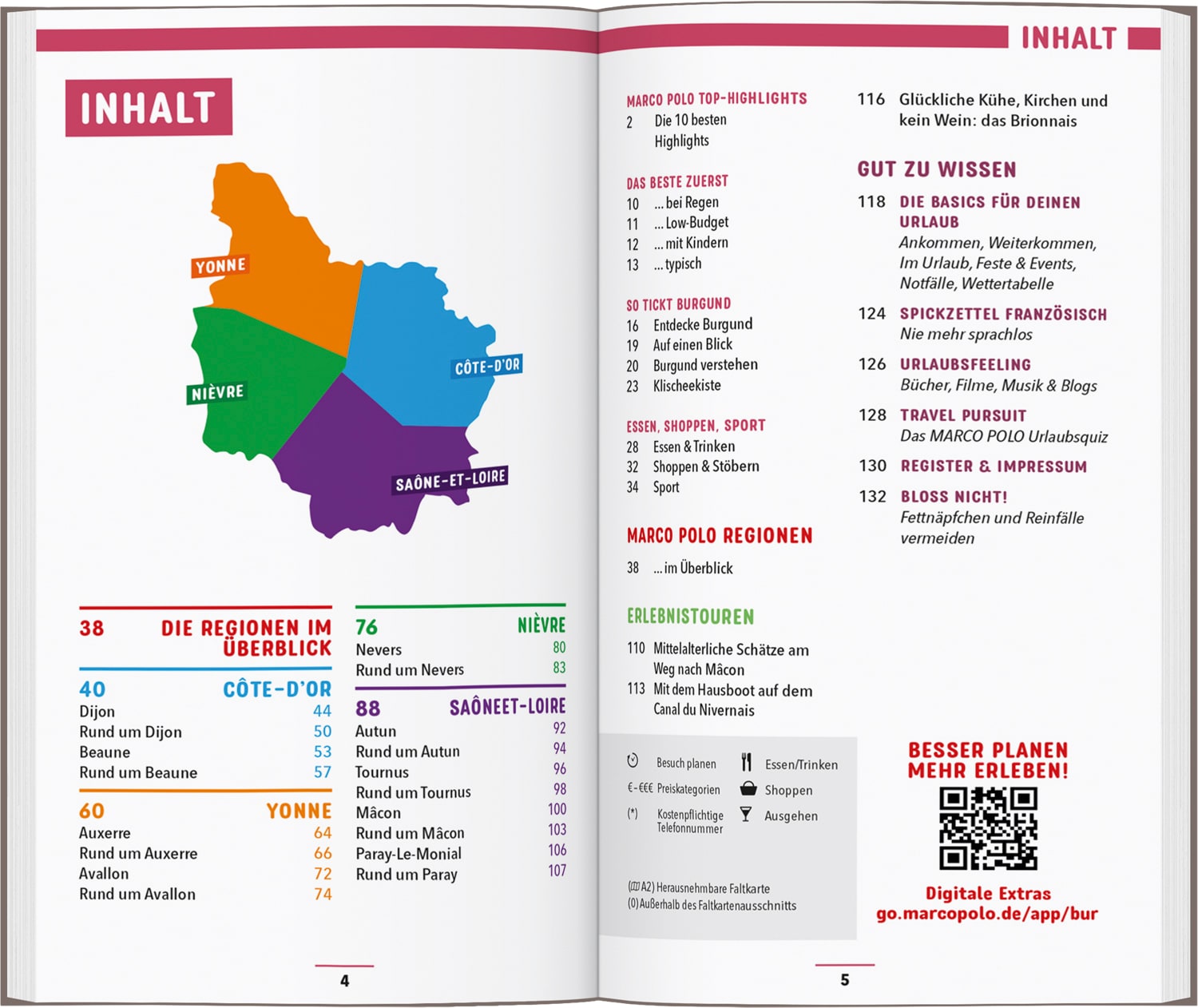 Urlaub im Herzen Frankreichs: Mit dem MARCO POLO Reiseführer durch Burgund Alles nur burgunderrot? In den Weinkellern der Region mag das vielleicht stimmen, aber draußen in der Natur hat Burgund den ganzen Farbkasten zu bieten: Das satte Grün der Hügel kontrastiert mit dem Blau des Sommerhimmels. Dazwischen liegen bunte Städte und verschlafene Dörfchen, die nur darauf warten, von dir wachgeküsst zu werden.Bist du bereit für deinen Traumurlaub? Dein MARCO POLO Reiseführer hält die besten Tipps für dich bereit und sorgt dafür, dass du nie die Orientierung verlierst.Erkunde Burgund mit den MARCO POLO Insider-Tipps, die nur die Locals kennenBest-of-Tipps für Low-Budget-Trips, Spannendes für Kinder und Unternehmungen bei schlechtem WetterRotwein verkosten, Dijonsenf shoppen, Paragliden: Die besten Spots zum Schlemmen, Shoppen und AktivseinSmarter planen, mehr entdecken: unterwegs mit den MARCO POLO Erlebnistouren und der kostenlosen Touren-AppSchnell und entspannt zu den Must-sees mit herausnehmbarem Faltplan und komplett überarbeiteten Highlight-KartenErlebe mit MARCO POLO Natur, Kultur und Abenteuer in Burgund!Nicht nur Rotwein-Liebhaber und Senf-Feinschmecker sind hier gut aufgehoben. Auch Kultur- und Naturgenüsse warten auf dich: Wandere im Eselgalopp durch die Wälder im Naturpark Morvan, besuche die romanischen Kirchen im Brionnais oder schippere mit dem Hausboot gemütlich den Canal du Nivernais hinunter. Zu viel Ruhe und Idyll? Kein Problem, beim Klettern und Raften ist Nervenkitzel garantiert.Mit dem MARCO POLO Reiseführer Burgund stellst du dir genau das Urlaubsprogramm zusammen, auf das du Lust hast mach es so, wie es dir gefällt!.