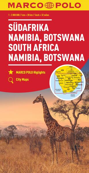 Hauptkarte 1: 2 000 000 mit mehrsprachiger Legende (GB, D, F, NL, I, E, CZ, PL) Übersichtskarte zum Ausklappen, Entfernungstabelle, Index: Marco Polo Highlights, 3 Citypläne: - Cape Town/Kaapstad - Johannesburg - Pretoria/ Wichtige Verkehrsinformationen (BW, LS, NAM, SD, ZA)/ Reiseinformationen/ Nationalparks, Naturparke und Welterbestätten der UNESCO Übersichtskarte der Bezirke/ Ortsregister mit Bezirk und Suchfeldangabe Ausgewählte Sehenswürdigkeiten, Landschafts- und Gewässernamen mit Suchfeldangabe
