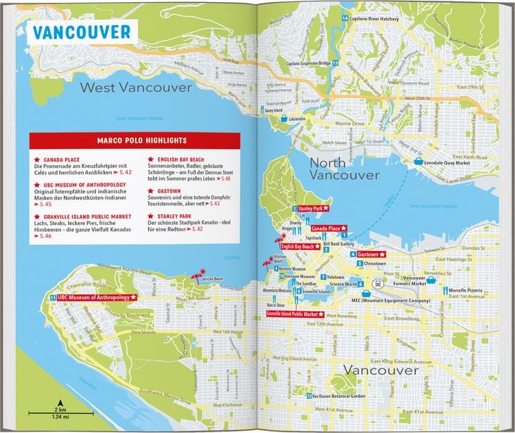 Gipfel, Gletscher und Grizzlys: Mit dem MARCO POLO Reiseführer Kanada West die Rocky Mountains & Vancouver erkunden Wale beobachten, den Pacific Rim Nationalpark durchwandern oder eine Nacht wie die Trapper zwischen Palisaden und Biberfellen im Fort St. James verbringen – so fühlt sich Kanada jenseits der Touri-Hotspots an! In deinem MARCO POLO Reiseführer Kanada West – Rocky Mountains & Vancouver findest du alles, was du für deinen Urlaub brauchst: Infos zur Anreise und Wissenswertes zum Reiseziel, Tipps für Übernachtungen, Shopping und Sport. Wandern, Kanu fahren, reiten: Die zerklüftete Pazifikküste und die Rockies bieten Traumkulissen für Outdoor-Sport Lachs, Steaks und Whiskey: Die kanadische Küche ist so vielfältig wie ihre Einwanderer. Mit den MARCO POLO Restaurant-Tipps weißt du immer, wo es am besten schmeckt! MARCO POLO Insider-Tipps: Unsere Autoren vor Ort kennen die besten Tipps für Kanadas Westen Nie mehr orientierungslos: Smarter reisen mit der kostenlosen MARCO POLO Touren App (mit Online- und Offlinekarten) Instant Urlaubsstimmung: Lesestoff und Filmfutter zum Einstimmen für deine Kanada-Reise Extra-Tipps für den Urlaub mit Kindern, für Low-Budget oder für schlechtes Wetter Maximal einfach: Reisen mit Insider-Tipps und Erlebnistouren von Marco Polo Mit dem MARCO POLO Reiseführer hast du alle Regionen in Kanadas Westen im Überblick: Rund um Vancouver und Vancouver Island, über British Columbia bis in die Nordterritorien, von den Rocky Mountains bis nach Alberta. Einmal vor Ort verpasst du mit den MARCO POLO Erlebnistouren keine der Besonderheiten der Region! Die Wildnis ruft! Erlebe mit deinem MARCO POLO Reiseführer eine unvergessliche Reise in den Westen Kanadas.