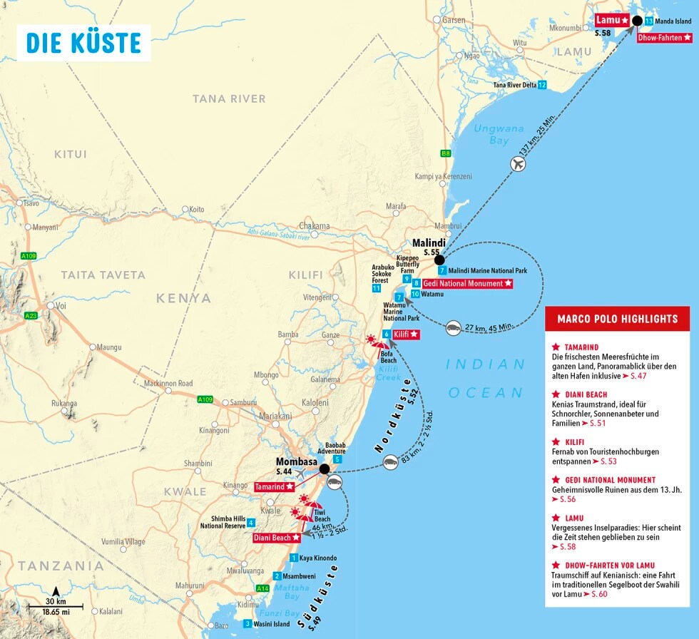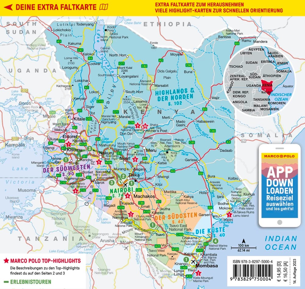 Schwimmen, tauchen, sonnenbaden? Klar, das kannst du in Kenia auch, zum Beispiel am Diani Beach mit seinem puderfeinen weißen Sand. Aber Kenia steht vor allem für Abenteuer und Wildnis-Feeling! Wie wäre es zur Abwechslung mit einer Radtour durch den Hell's Gate National Park, vorbei an grasenden Zebras und Antilopen? Wenn es dir in der Savanne zu heiß wird, kannst du auf die schneebedeckten Gipfel des Mount Kenya wandern oder die lauen Nächte in Nairobis Clubs durchtanzen. Mit deinem MARCO POLO Reiseführer Kenia findest du immer schnell zum nächsten Ziel und erlebst einzigartige Urlaubsmomente!.