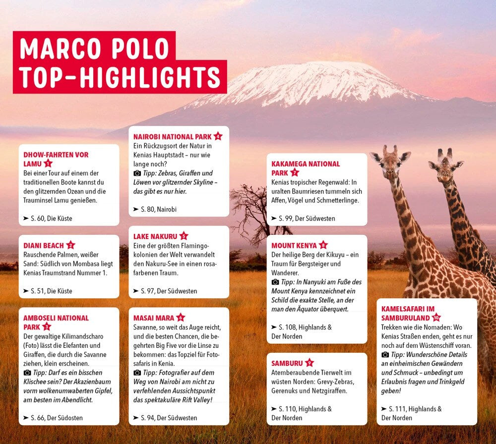 Der MARCO POLO Reiseführer Kenia: Urlaub zwischen Paradiesstränden und Savannenstaub Goldene Strände mit türkisfarbenen Wellen, jadegrüne Seen im roten Savannensand und weiß getupfte Bergspitzen neben bunten Metropolen - mehr Farbenpracht als in Kenia passt nicht in einen Urlaub. Dein MARCO POLO Reiseführer verrät dir, welche Sightseeing-Highlights du nicht verpassen darfst und was die Einheimischen an ihrem Land lieben. Wähle aus, worauf du Lust hast, und verbringe deinen Urlaub genauso, wie du ihn magst!