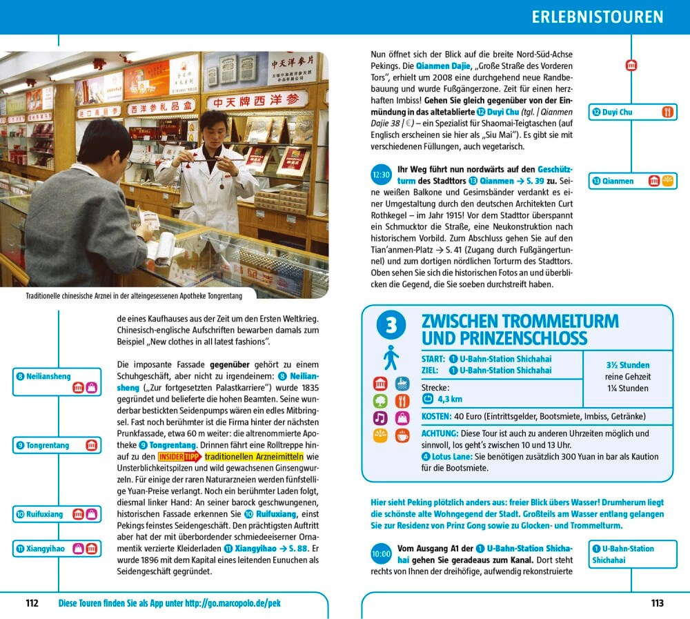 Kompakte Informationen, Insider-Tipps, Erlebnistouren und digitale Extras:Erleben Sie mit MARCO POLO die chinesische Hauptstadt intensiv vom Frühstück bis zum Nightcap. Mit dem MARCO POLO Reiseführer kommen Sie sofort in Peking an und wissen garantiert, "wohin zuerst". Erfahren Sie, welche Highlights Sie neben dem Kaiserpalast und dem Tian'anmen-Platz nicht verpassen dürfen, dass Sie im alteingesessenen Schuhgeschäft Neiliansheng wunderschön bestickte Seidenpumps bekommen und wo Sie sich hinbegeben sollten, wenn Sie es den Chinesen gleichtun und sich ausgiebigem Frühsport hingeben wollen: vom Schattenboxen über Aerobic bis zum Urschrei-Qigong.