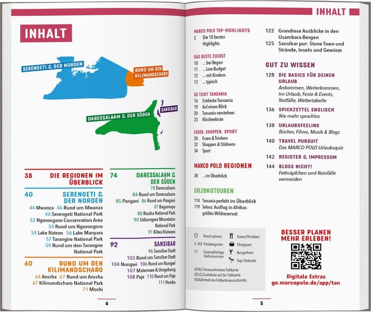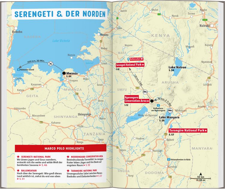 Tauch ein ins Paradies-Feeling mit dem MARCO POLO Reiseführer Tansania & Sansibar Der größte Vulkankrater der Welt, der höchste Berg Afrikas und riesige Nationalparks – Tansania lässt sich nicht lumpen, wenn es um Top-Spots für deinen Traumurlaub geht. Naturfreunde gehen in der Serengeti auf Entdeckungstour und besuchen die „Big Five“ der Tiere: Elefant, Nashorn, Büffel, Löwe und Leopard. Wer sich lieber unter Menschen ins Getümmel stürzt, erlebt in den Städten ein Kontrastprogramm aus verschiedensten Ethnien, Sprachen und Traditionen. Genieße weite Strände, exotische Düfte und Bongo-Beats in Tansania und Sansibar! Mit dem MARCO POLO Reiseführer im Gepäck zeigt sich Ostafrika von seiner schönsten Seite. Ausflug ins Wildreservat oder kraxeln in den Usambara-Bergen: Unterwegs mit den MARCO POLO Erlebnistouren und der kostenlosen Touren-App Entdecke mit den MARCO POLO Insider-Tipps, was die Einheimischen an ihrem Land lieben Mandazi naschen, Kangas shoppen, mit Schildkröten tauchen: MARCO POLO kennt die besten Spots zum Schlemmen, Shoppen und Aktivsein Best-of-Tipps für den Urlaub mit Kindern, Ausflüge mit kleinem Budget und Regentage Niemals planlos in der Serengeti dank komplett überarbeiteter Karten Unvergessliche Erlebnisse zwischen Afrika und Orient mit MARCO POLO In Tansania wird jeder Urlaubstag zum Abenteuer. Erkunde verfallene Sultanspaläste auf Kilwa Kisiwani, werde im Cheetah’s Rock zum Raubkatzenflüsterer oder schwing dich in den Sattel und umrunde Afrikas höchsten Berg auf dem Mountainbike – atemberaubende Ausblicke und Traumselfies inklusive. Worauf hast du heute Lust? Mit dem MARCO POLO Reiseführer für Tansania und Sansibar stellst du dir genau den Urlaub zusammen, den du dir wünschst!