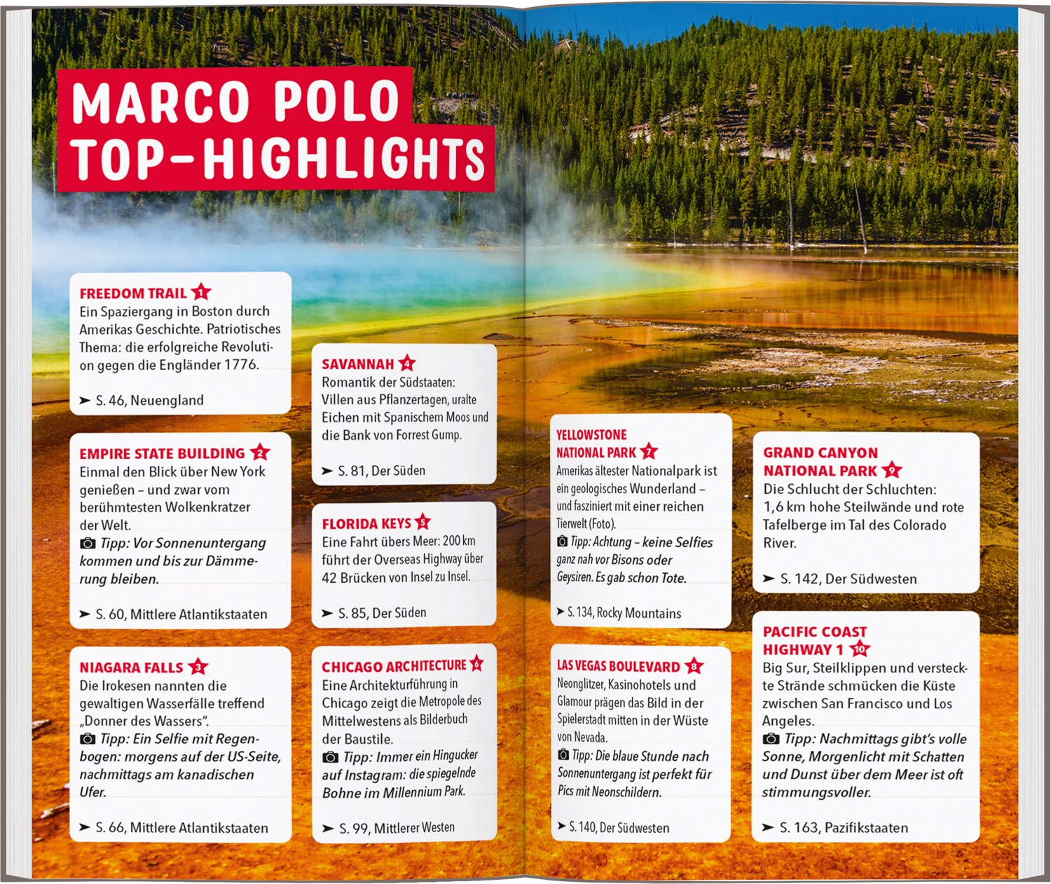 Mit den vielen Tipps in deinem MARCO POLO Reiseführer stellst du dir jeden Tag genau das Urlaubsprogramm zusammen, auf das du Lust hast. Erklimme die höchsten Pässe der Rockies, lerne Florida von seinen schönsten Seiten kennen oder fahre einmal die berühmte Route 66. Alles Wissenswerte für die Reiseplanung findest du in deinem MARCO POLO Reiseführer USA. So behältst du auch unterwegs immer den Überblick!